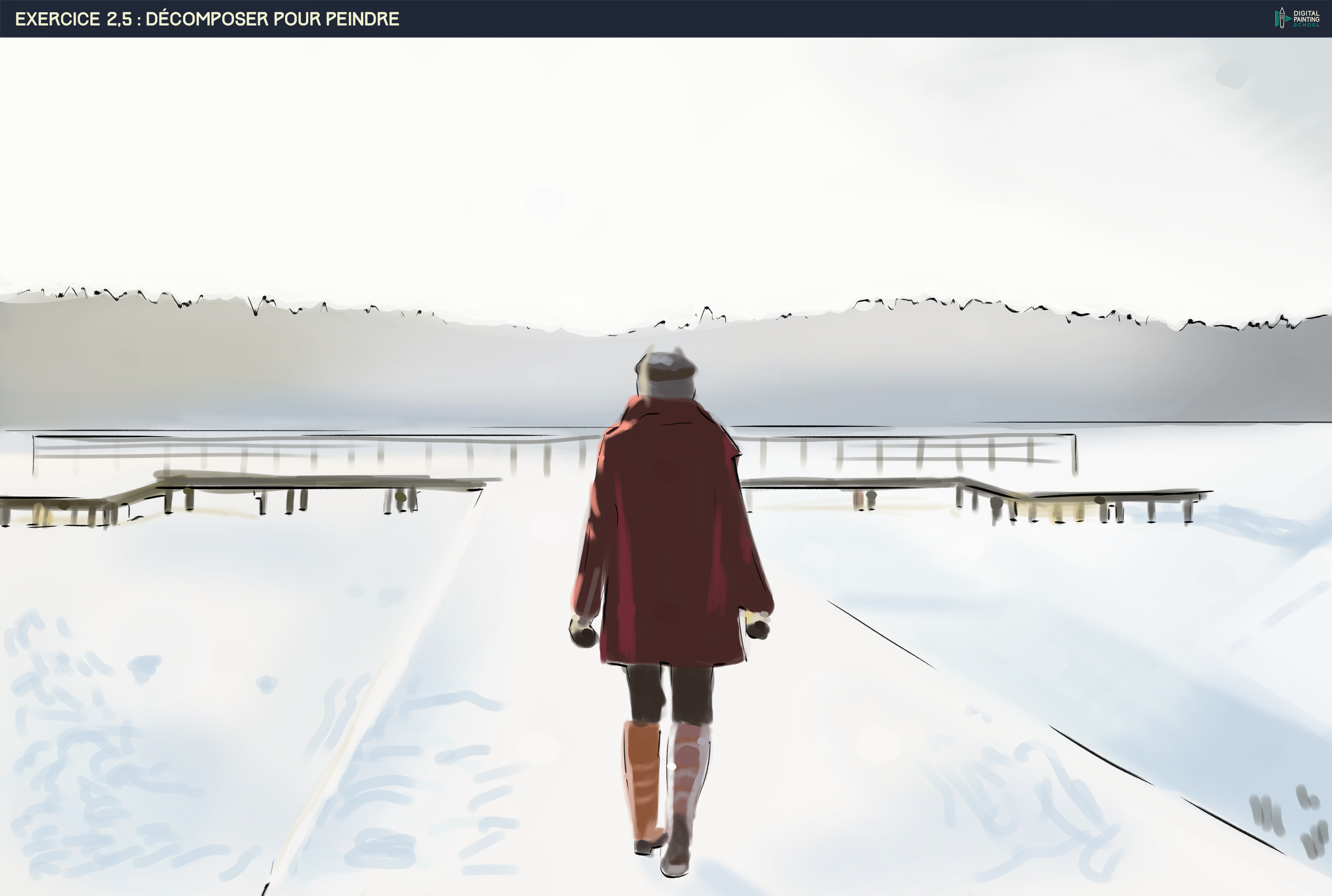 Bonjour, Voici mon tout premier digital painting via l'exercice 2,5. J'y ai passé beaucoup plus de temps que ce que je pensais surtout sur la fille. C'est pour ça que je n'ai pas du tout poussé le décor car je sais que les prochains exercices sont de l'environnement. Je reviendrai l'améliorer sûrement plus tard.