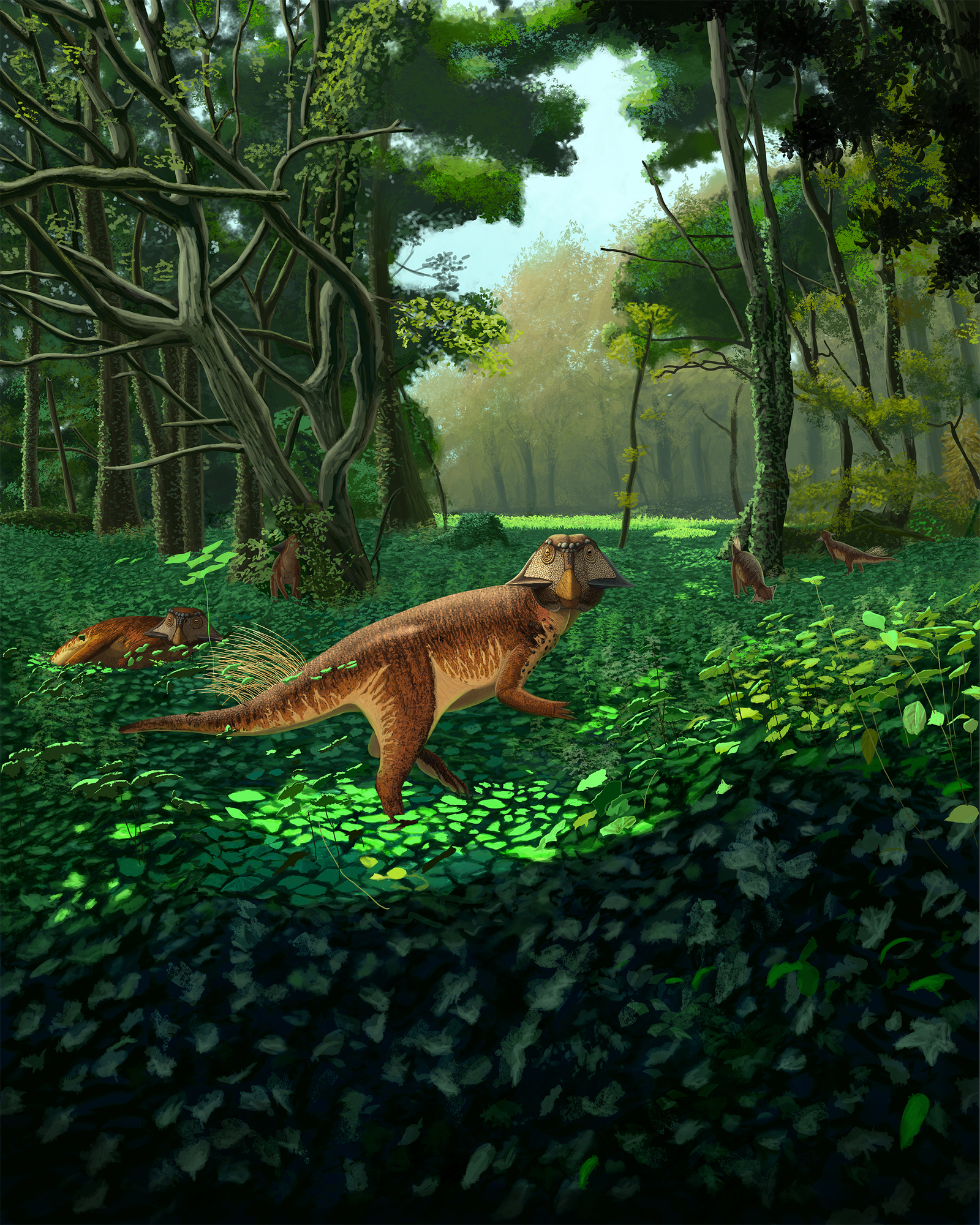 WIP Quasi-fini de Psittacosaurus dans son environnement. J'aimerais bien avoir des conseils pour améliorer cette illustration, notamment le choix des couleurs (pour les arbres). Parce que j'en ai ras-le-cul de ce dessin, il m'a pris beaucoup trop de temps et j'ai eu trop de mal avec le choix des couleurs. -
