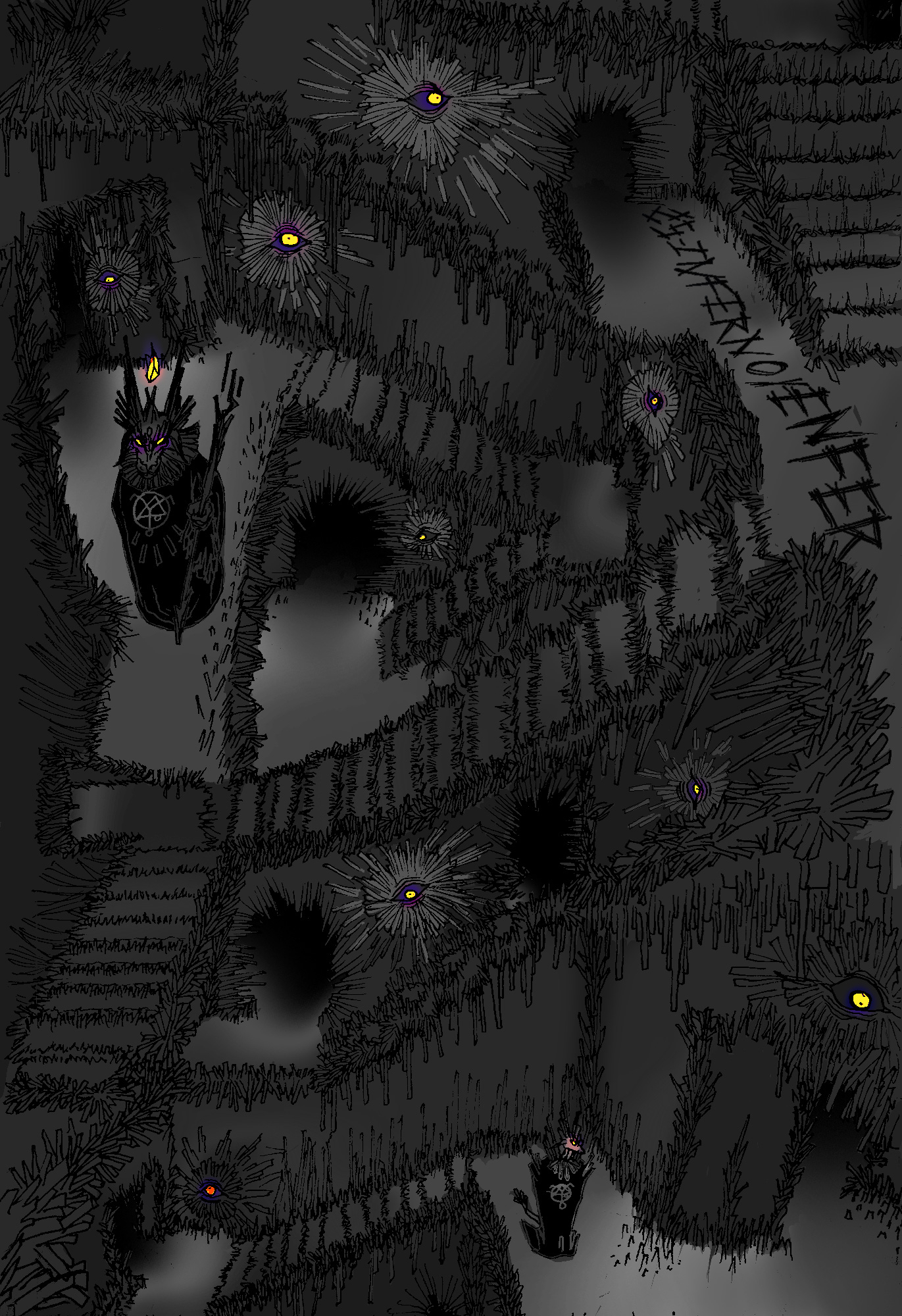 Bonjour tout le monde ! @Image.In.R Eh ben vu la taille des Enfers, l'éternité ne sera pas suffisant pour tout casser 😆 Bonne idée pour mélanger les deux thèmes. @daff Ma doué que c'est cool et efficace ! Je suis super fan du résultat. Le passeur d'âme est sombre et sinistre, tout ce que j'aime 😆❤️. Pour ma part voici ma participation. Au début je voulais vraiment faire un environnement chaud et étouffant, en m'inspirant des travaux de M. C. Escher. Puis je trouvais ça moins intéressant de reprendre du classique brûlant. Du coup je n'ai gardé que les nuances de gris, des structures en pics fins, des entrées sombres sans fin et sans repère, et des surveillants omniprésents. L'Enfer est labyrinthique, sombre et on ne sait pas ce qui se passe...