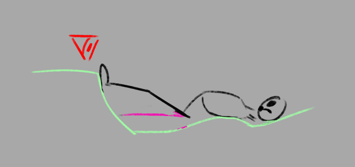 Hello ! Oulah je vois que tu n'as aucune réponse depuis le 29 Mars, c'est étrange. Je te présente mes excuses en tout cas ! (Dans ces cas là, si tu vois que l'attente dépasse 3 jours, hésite pas à reposter, on est jamais à l'abri d'un éventuel faux-pas de la part du formateur). En tout cas le principe de ton illu est très sympa j'aime beaucoup ! J'aime bien l'idée de la jambe qui vient vers la caméra, je trouve que ça fait juste un poil bizarre la bosse sur lequel le pied s'appuie au premier plan. En fait, l'organisation du sol fait un poil étrange, de profil le squelette couché par terre ressemble à ça : La ligne du sol en vert, la caméra en rouge et en rose j'ai fais l'autre jambe du squelette où on sait pas trop où elle va du coup ! Donc je donne l'exemple un peu salement en overpaint mais ça te donnera une idée : - Toute la zone de sol au niveau du dos et de la tête peut-être un seul et même plan au même niveau,, ça permettra de plus facilement faire croire à la position du squelette - Le bras qui est à notre gauche peut aller passer derrière l'arbre plutôt que tomber dans un trou qui fait un peu artificiel vu qu'il sort de nul part - La jambe à notre gauche peut-être replacer un peu différement et on peut même la faire voir en la faisant croiser sous la jambe en l'air et ressortir à droite dans le fond. Le fait de voir l'autre pied pourra même bien jouer sur l'effet de perspective que tu veux donner - Au premier plan, pour pas avoir à tout retaffer autrement ta compo on peut dire que c'est une branche couverte de mousse sur laquelle est posé le pied (plutôt qu'être appuyé contre un peu étrangement, autant le poser dessus) ce qui justifiera que le sol au premier plan soit aussi haut par rapport au corps ! Sinon l'idée est très cool, attention à pas trop faire le fond de la forêt en mode papier peint mais vraiment montrer que la forêt est profonde ! (pour ça y a pas de secrets, prendre de bonnes refs photos !) Hâte de voir la suite ! -