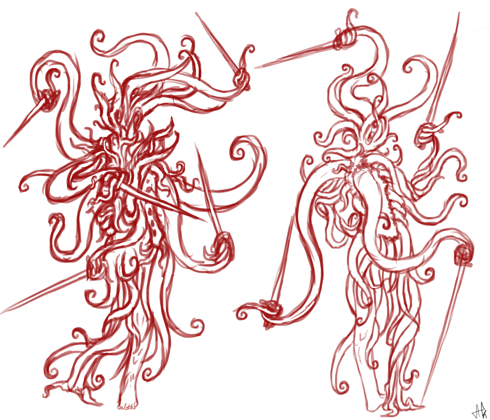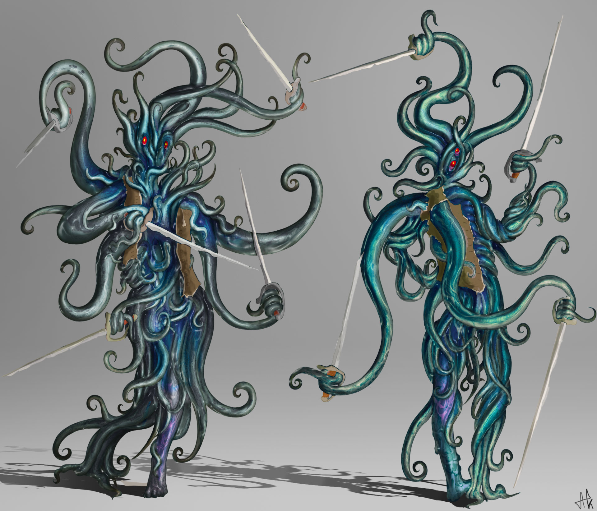 Allez on continue dans les recherches sur la forme de la créature. Je me dis que si on l'envoie en premier pour surprendre l'adversaire en sabotant un maximum l'intérieur du bateau et en attaquant par surprise les marins, elle doit avoir un niveau assez correct d'intelligence. Certes le plus facile pour elle est de faire tourbillonner ses épées dans tous les sens, mais je rajouterai un côté plus vicelard : elle sait comment faire taire en silence les premiers marins dès qu'elle rentre dans le navire en les étouffant avec ses tentacules (un peu comme le fait Davy Jones dans Pirates des Caraïbes 3 avec un des amiraux si vous voyez la scène). Et avec un aspect plus filiforme, elle commence par l'infiltration, puis après le bordel 😄 ! -