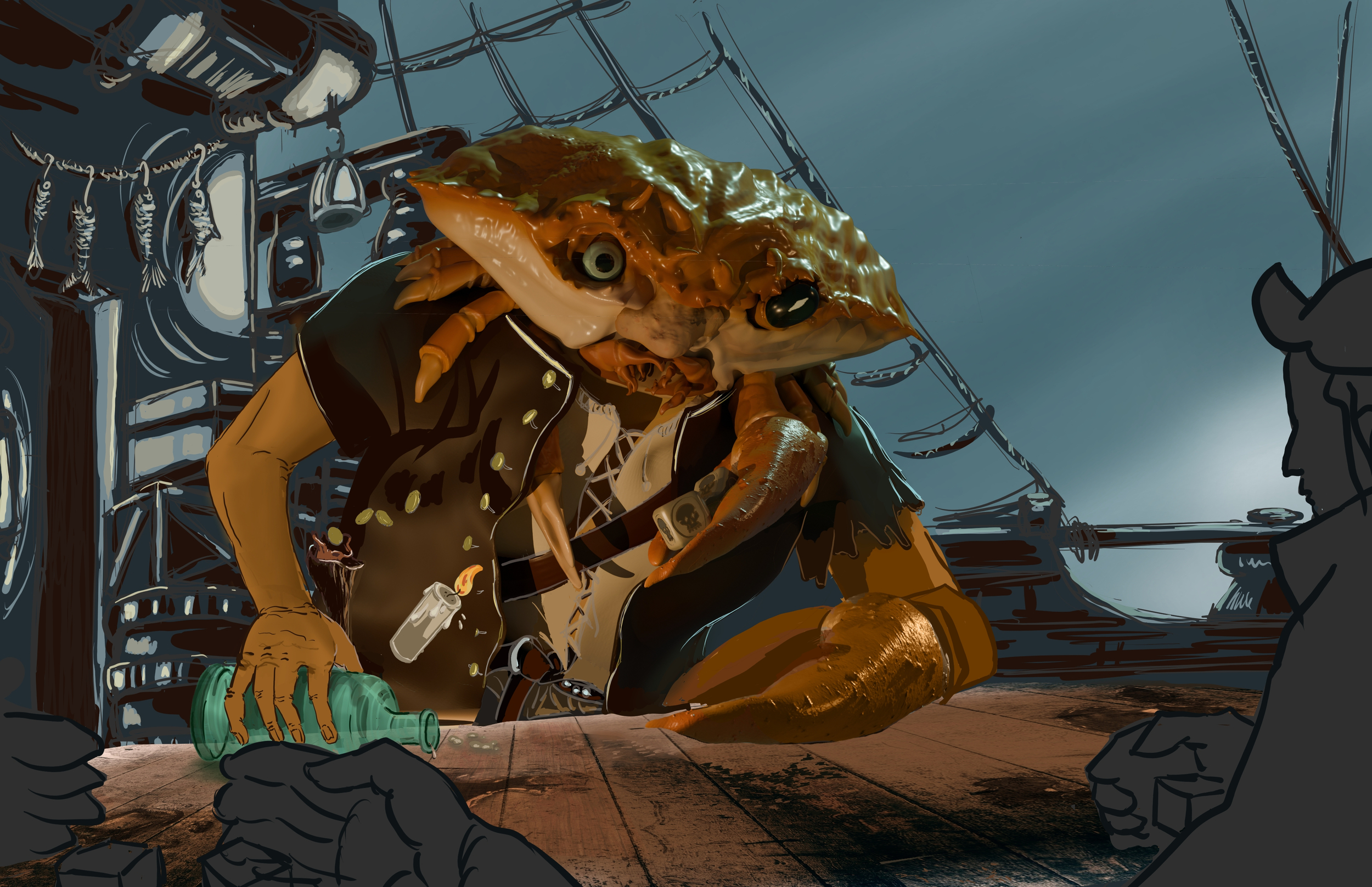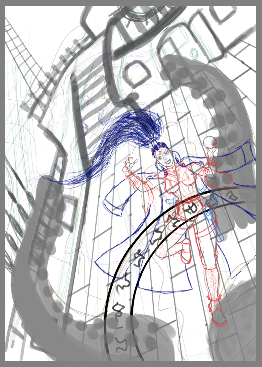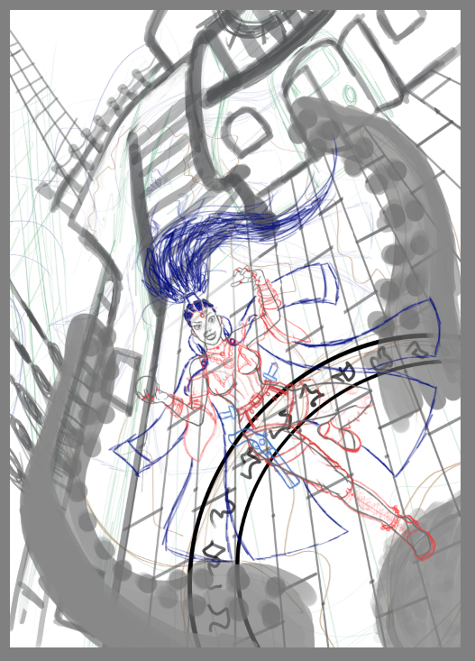 Voilà mon retravail du début d'aprem, je continue après une petite pause. J'ai revu la position du bras, et la compo générale. En gros, elle invoque un kraken sur le pont principale d'un bateau par une nuit de tempête... Est-ce que je sors de ma zone de confort (qui se limitait à des bonhommes batons et des petits emotes moches et mal fait) ? Oui. Est-ce que je le referais ? Absolument. Est-ce que je m'éclate ? A donf. -