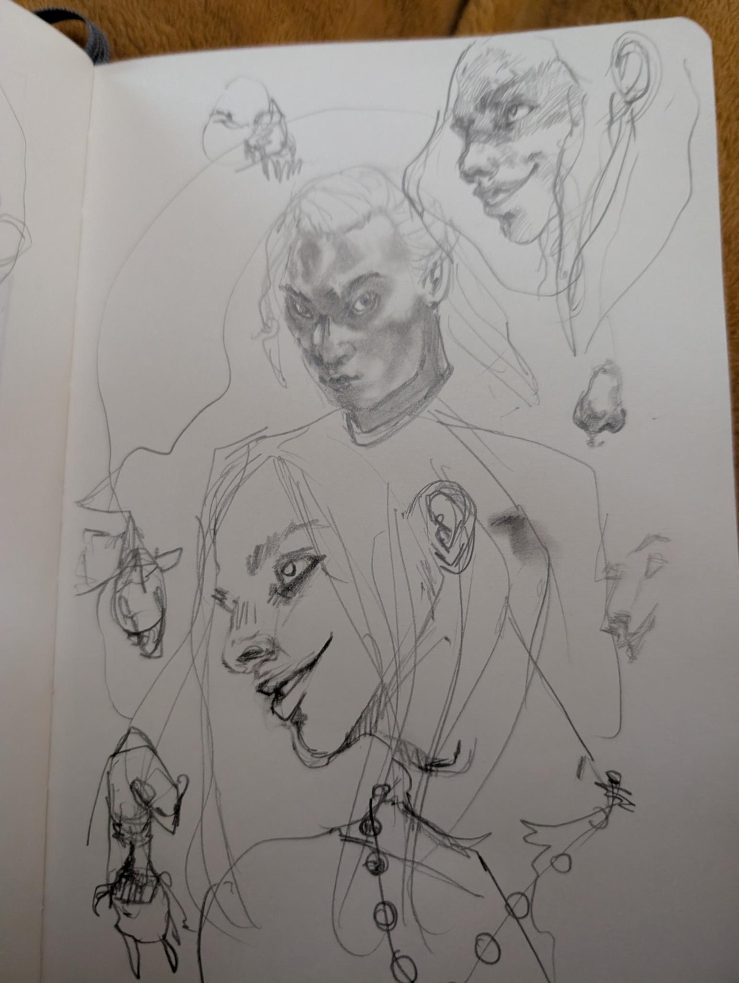 Allez, 1er croquis pour ce beau challenge. J'ai opté pour ce bon vieux Tomas Pearl qui me semble être le perso le plus approprié pour l'illu' que je voulais "raconté". encore pas mal de choix à faire (texture des vêtements, pattern des "écailles" des sirènes) Mais déjà un récit et des choix qui se mettent en place: Pour se retrouver dans cette situation, il est clair que Mr Pearl à été jeté à la mer et il est donc normal qu'il soit peu "équipé". Malgré tout j'ai essayé de garder des éléments de design intéressant, notamment son collier et les gravures sur ces bottes, avec le design des cœurs brulants (un crane qui reprends la forme d'un cœur) la dent de requin qu'il a du récupérer lorsqu'il passait l'épreuve de jeune pirate, et la bague ancestrale de sa famille. J'ai essayé l'originalité pour le design des sirènes, en essayant de ne pas aller trop loin... (le design "sirènes-crevettes" était too much ) voila y'a encore beaucoup de boulot, ne serait-ce que pour sortir un line-art propre. J'espère avoir le temps, wish me luck... -