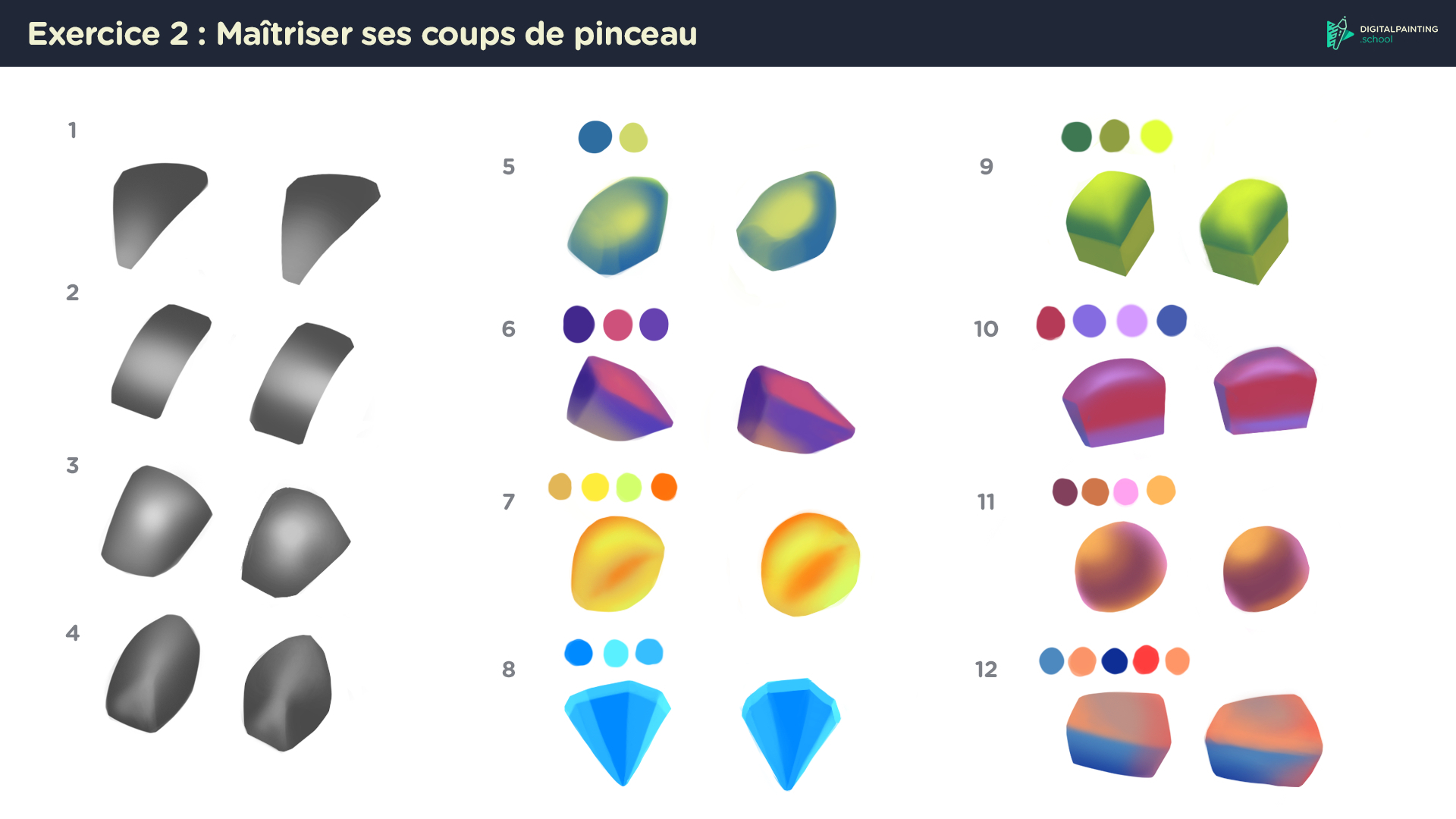 Hey @Anih yes c'est mieux au niveau de tes transitions ! -c'est comme tu le sens , certaines formeq manque encore un peu de justesse: - -notamment ces trois la , la verte est pas encore dans la bonne perspective , elle est trop vue de coté , ta forme violette devrait piquer plus vers la droite en bas et le diamant en effet est du mauvais coté -pour ta forme bleu et verte celle ci colle le mieux a la ref Sinon le reste est bcp mieux c'est bien 😉 continue comme ça a toi de voir si tu te sens d'enchainer avec les autres exercices 😉