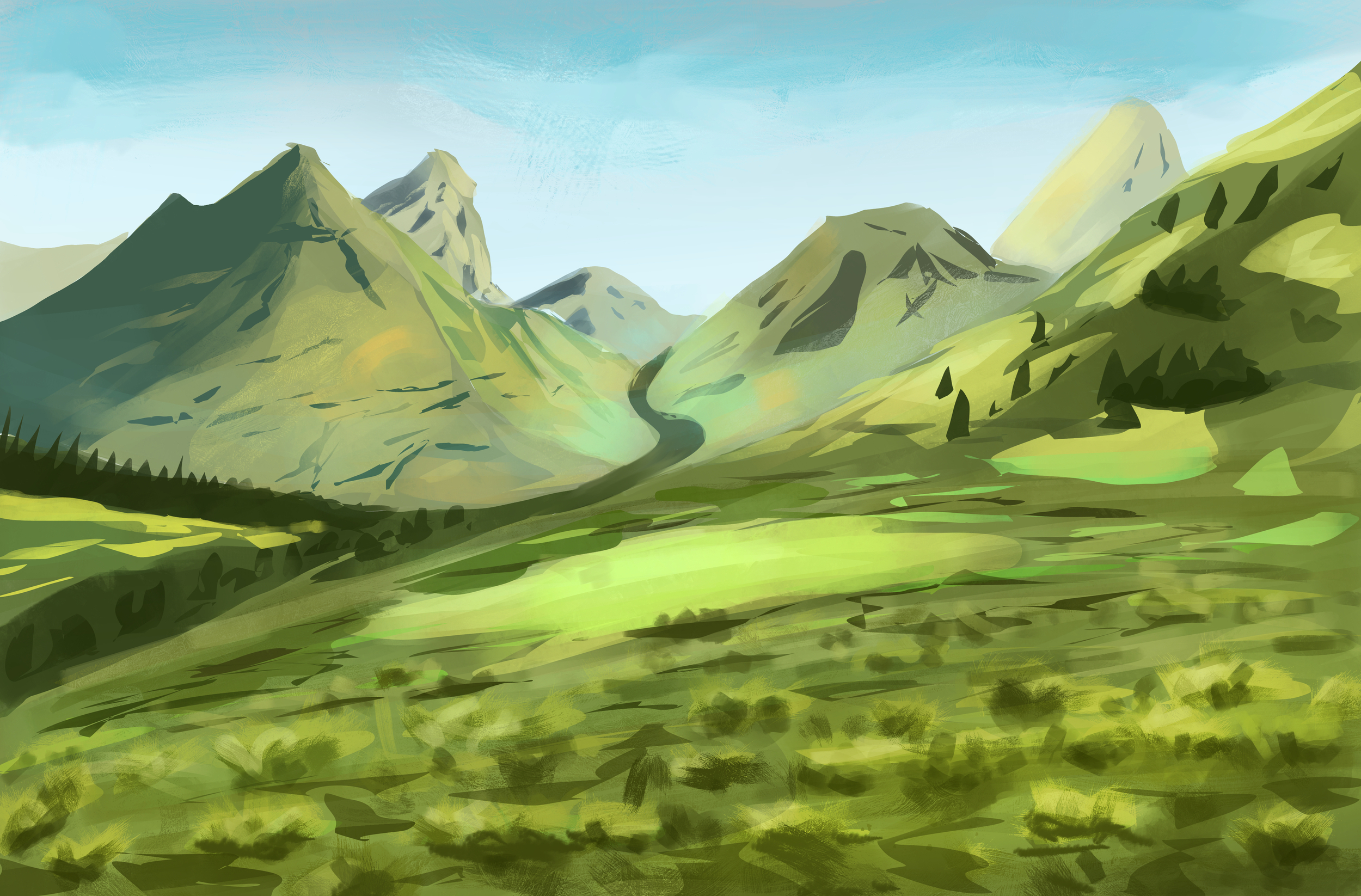 Hey @Patrick! yes c'est bcp mieux pour a montagne ! -ton premier plan est vraiment mieux , attention tu a deux éléments blanc parasite ici -tu devrait avoir un creux en dessous de ton pont ici , pour l'instant il chevauchent ta l'herbe et a l'air juste posé dessus -tes cascade ici sont un peu trop larges et droites, essaye de les faire dans le sens du volume légèrement arrondies vers la gauche - pour ta montagne en arrière plan c'est mieux on voit que tu a essayé de simplifié les valeurs mais tu peux encore simplifier davantage , tu as une valeur claire grise qui parasite un peu le reste ici , décompose en deux valeur une pour la roche et une pour la neige , et pour la structure pense que la neige coupe la montagene en différent étage stries horizontale et verticales 😉 sinon c'est good ça progresse c'est vraiment bien !;)