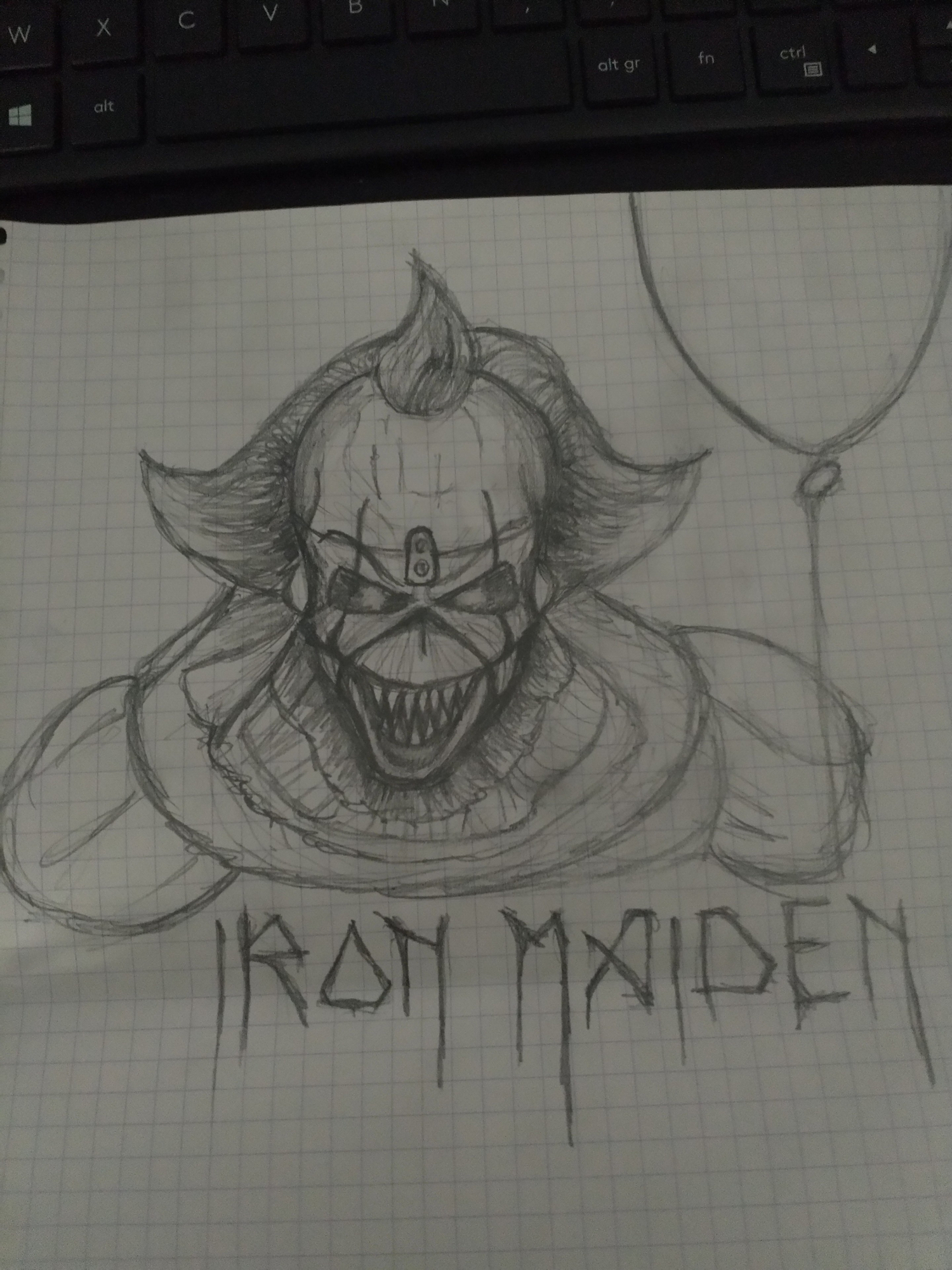 Hello, Je vous partage un nouveau projet sur lequel je travaille 🙂 Il y a quelques années, j'avais griffonné un croquis (pendant la pause dej au bureau 😄). J'avais imaginé Eddie The Head (la mascotte d'Iron Maiden ❤️🔥🤘), mais grimé en Pennywise / Grippe-Sous de Ça. J'ai laissé ce croquis de côté en me disant que je devrais un jour le reprendre pour en faire un vrai painting. Eh bien ça y est, j'ai décidé de lancer le chantier ! Je suis encore dans la phase de croquis, mais voilà, je vais commencer à partager le travail ici. À bientôt pour la suite ! Et vive Iron Maiden !