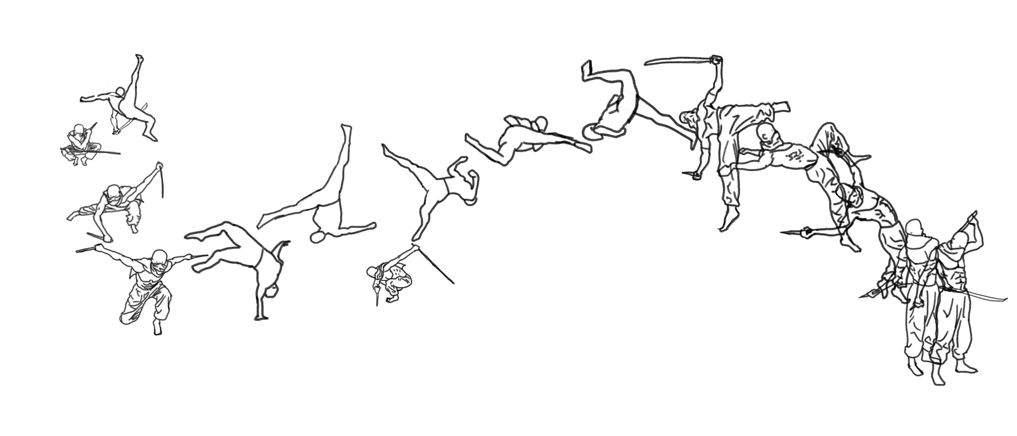 Nouvelle progression : Avec quelques ajouts intermédiaires pour Mieux comprendre un retournement un peu compliqué vers la fin Avoir plus de poses vers la fin puisque plus on arrive vers la pose finale, plus on "rattrape" le temps (me semble-t-il 🤔) Avec l'inclusion de profondeur dans la trajectoire, en rapetissant puis agrandissant le perso Je ne sais pas si c'est mieux, j'ai les acrobaties dans la tête mais il faut que tout le monde comprenne !