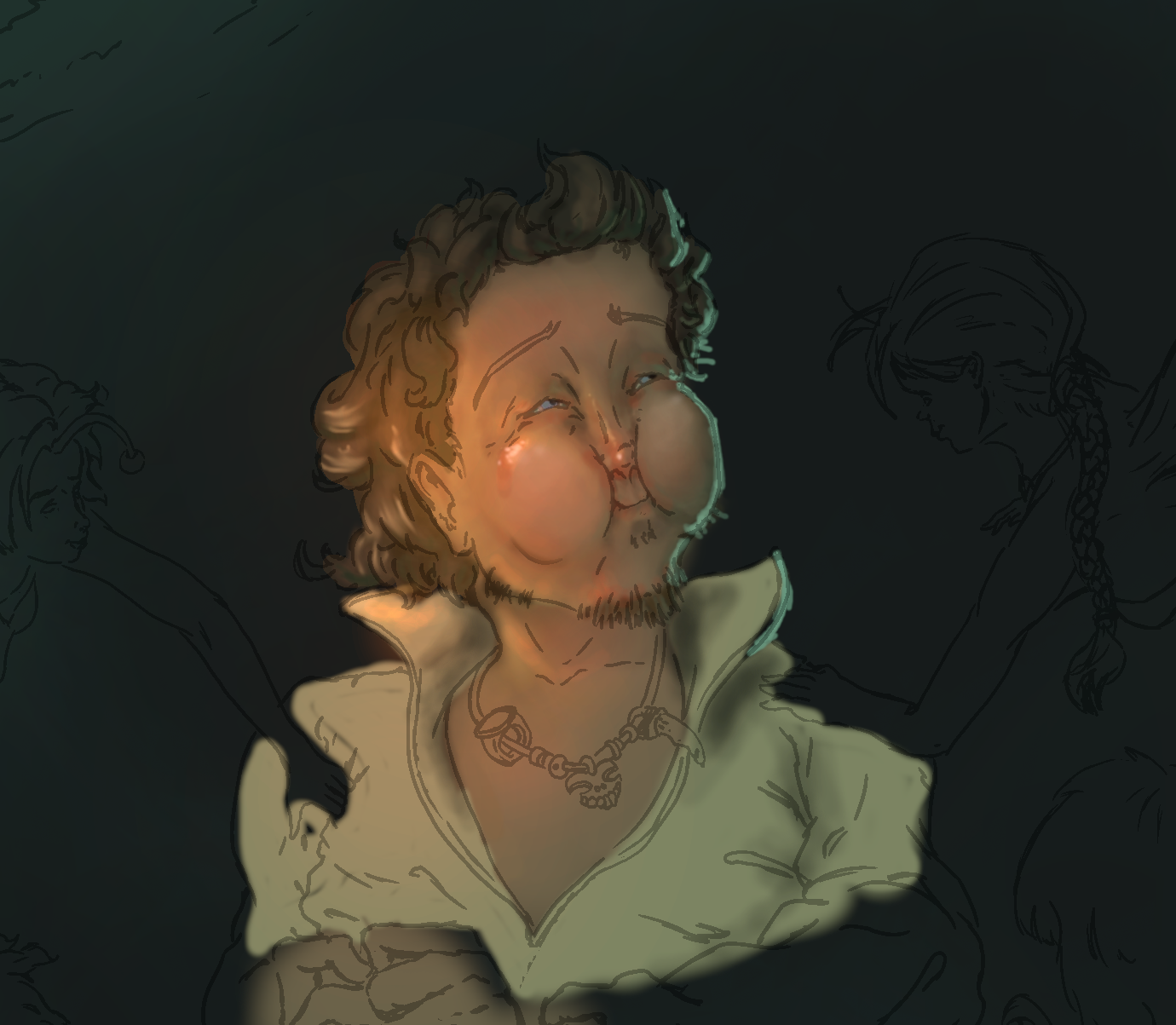 Hello, c'est cool, bientôt finis 👍 pour ma part je pense que c'est mieux que tu ai le focus juste sur le perso et le péroquet, je pense que sakado est pas forcement nécessaire. pour les cheveux est ce qu'ils émette de la lumière ? sinon tu peu ajouter un peu d'ombre sur l'arrière et essayé de simplifier un peu, les petits cheveux charge un peu l'image je pense. Je t'ai fait un test pour que tu vois ce que ça peu donner Bon courage pour la fin !