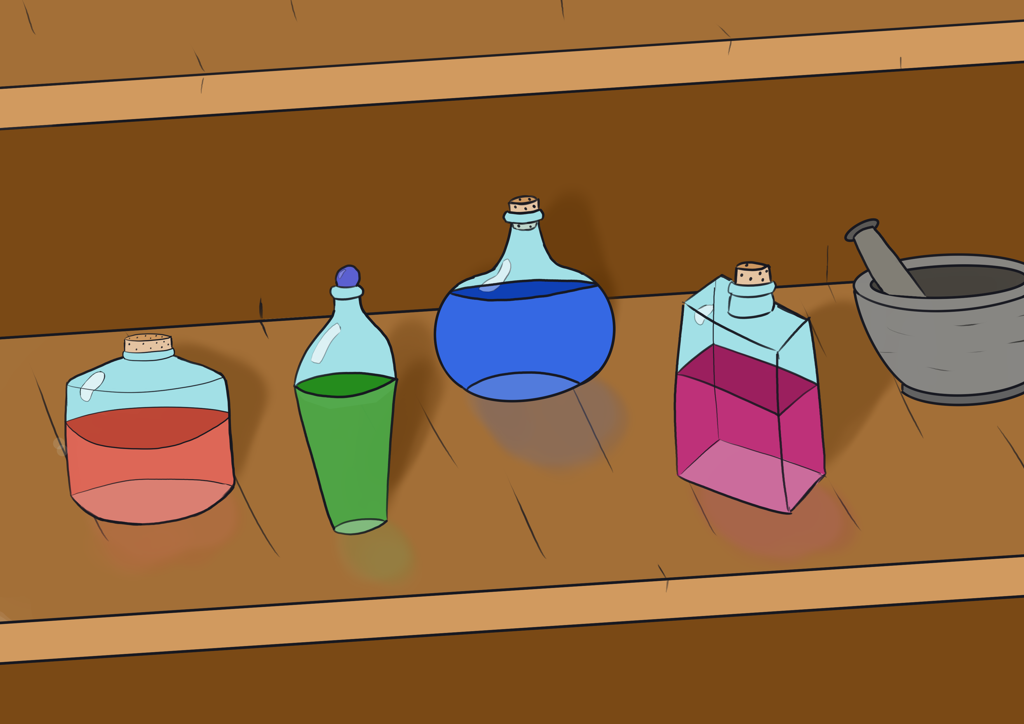 Hello, je poste mon 1er essai de digital painting sous Krita ! Je suis parti sur une étagère d'alchimie, avec différentes formes de fioles, du fluide, des couleurs,.. Je me dis que ça sera intéressant à refaire plus tard avec plus d'expérience et plus de maîtrise de la perspective, de la lumière.. J'ai vaguement essayé de faire des ombres et des lueurs colorées (je suis pas trop convaincu par le rendu de ces dernières 🤨) Quelques précisions : Je ne sais pas DU TOUT dessiner, espérons que j'arrive à changer ça avec la suite des chapitres 😄 Je ne sais pas non plus bien utiliser Krita, donc je suis affreusement lent, et je suis pas sûr d'utiliser les outils à bon escient, mais bon ça c'est une question de pratique. Sur ce, je vais attaquer la suite 🤓