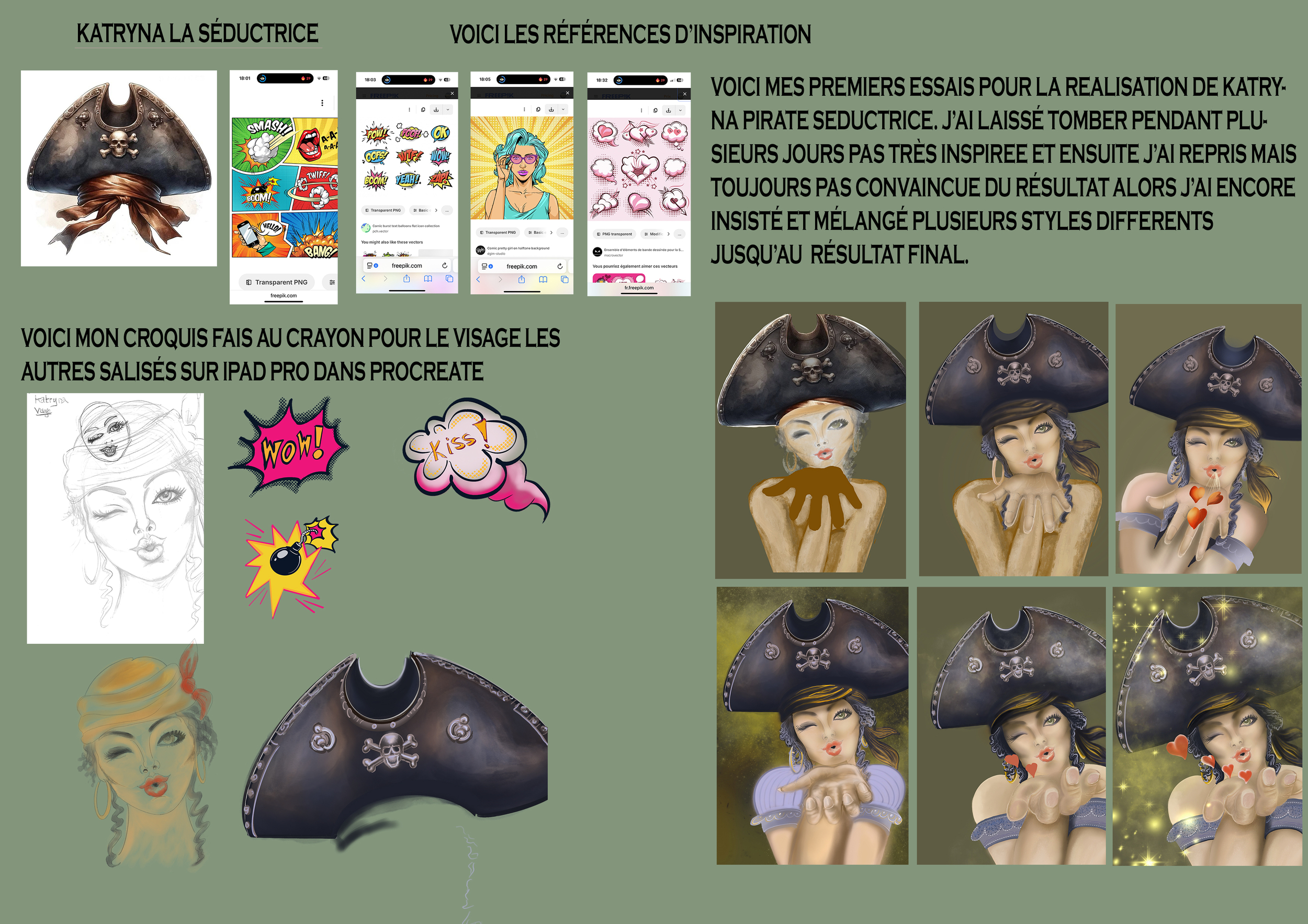 Bonsoir, pour ma seconde participation j'ai réalisé en pas mal d'étapes et après avoir fait beaucoup de modifications dans mon Digital painting pour Katryna la Séductrice. j'ai repris à plusieurs reprises ce dessin pour changer la main, le style, la position et j'ai un peu mélanger plusieurs styles différents. voici mes recherches et dessins réalisés ainsi que le final style comics pop art. j'espère que ça vous plaira ?