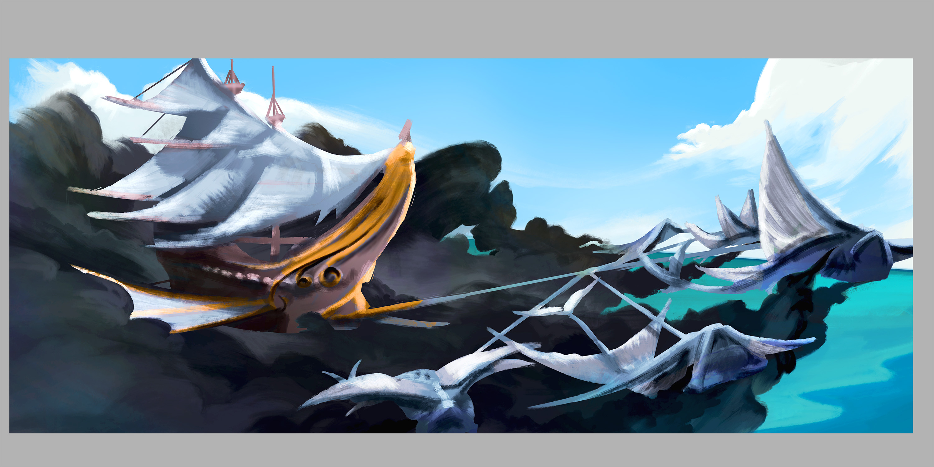 Suite du travail de la scène avec le travail des couleurs, de la lumière et de l'ambiance. J'ai essayé de garder une ambiance froide malgré la dominance de la lumière sous-entendued'une torche. J'ai plus détaillé le ciel pluvieux en arrière plan. -