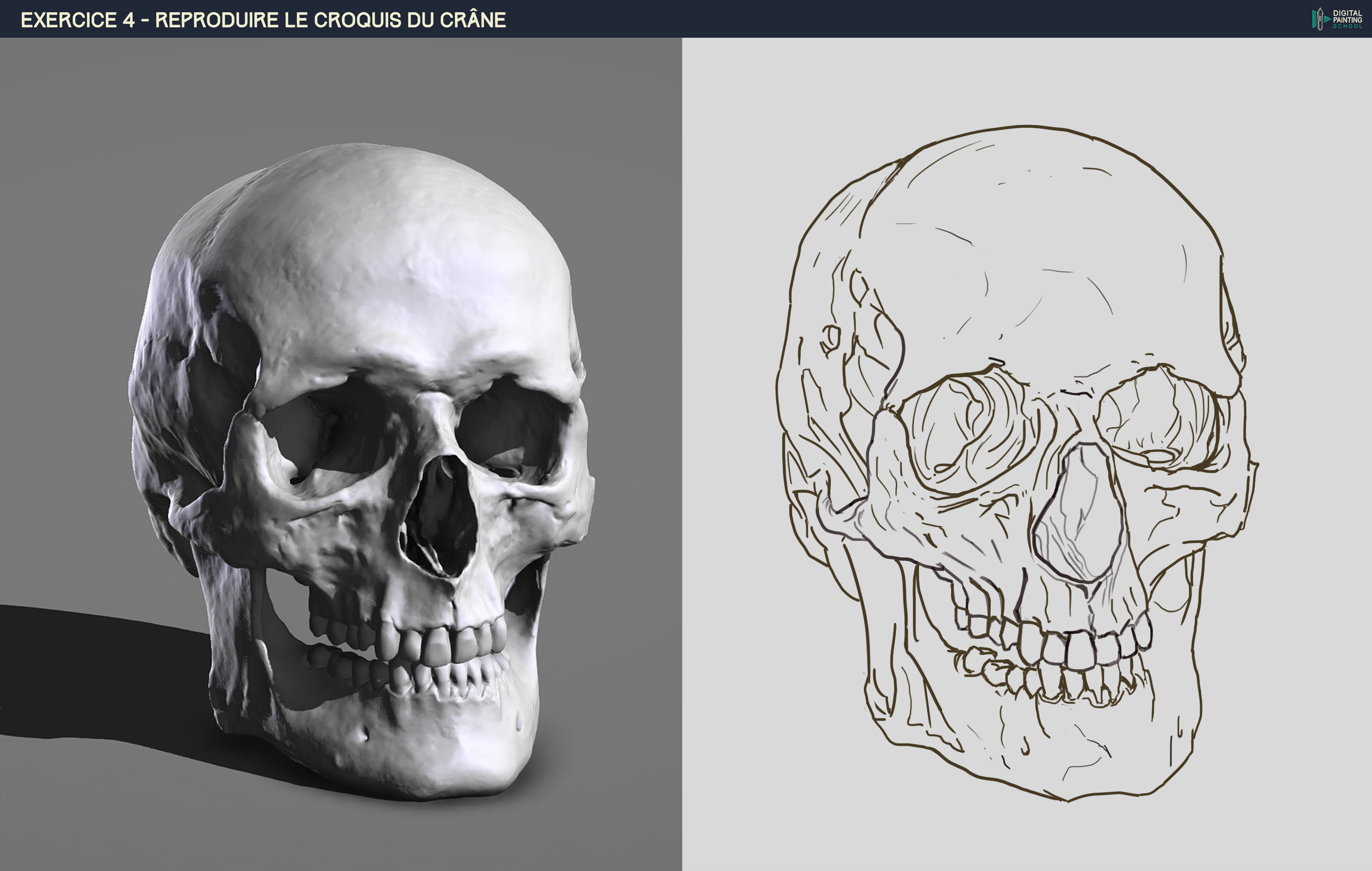 Voici l'exercice du crâne, j'ai ajouté sur un calque en dessous 2-3 valeurs rapides pour plus de lisibilité. En le revoyant je pense qu'il y a une erreur (enfin sûrement pas qu'une, mais celle là me saute plus aux yeux) sur l'orientation. Je pense l'avoir fait trop "de face". Et aussi la gestion de l'épaisseur du trait, je pense que j'ai fait quelque chose de trop uniforme, ça gêne la lisibilité. Pas facile encore une fois de lâcher le crayon pour le stylet 😅