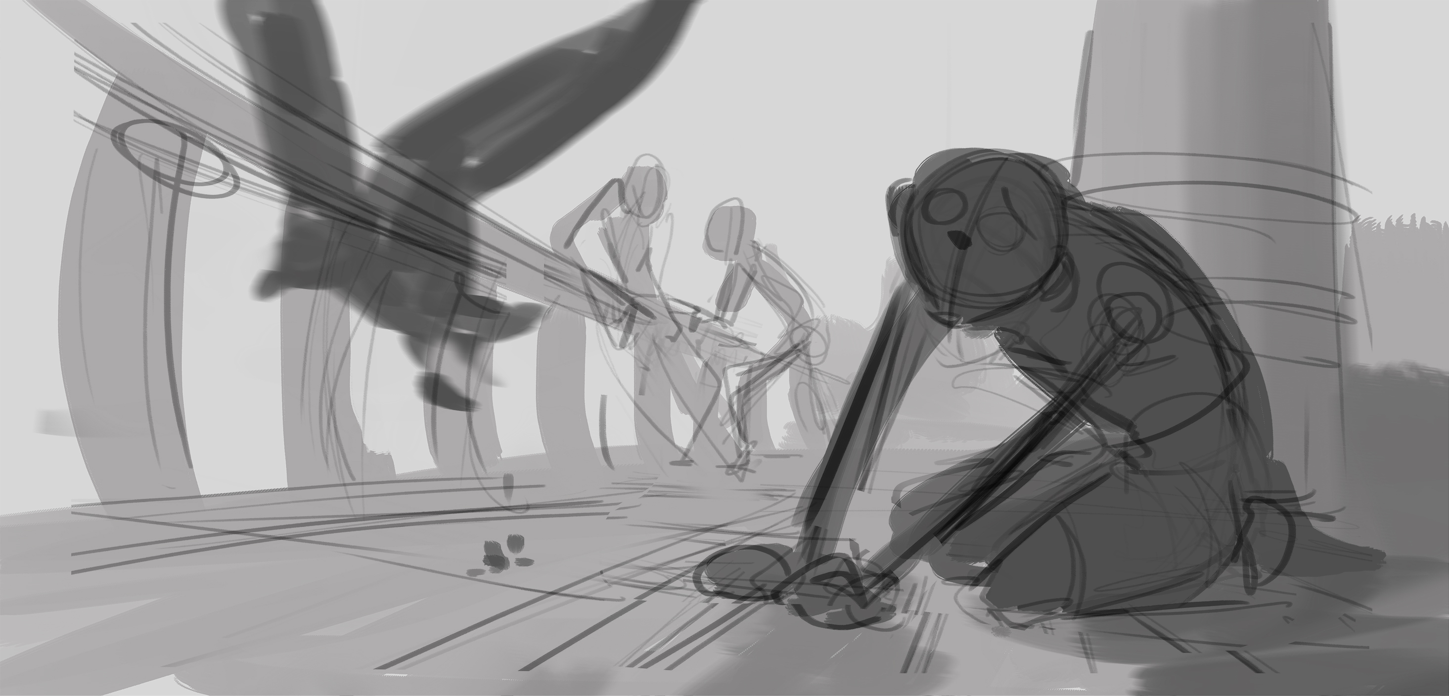 Hey, j'ignorais qu'il fallait créer un forum quand j'ai commencé à dessiner pour le concours hahah. Donc voici mon travaille jusqu'ici. J'ai tout d'abord créé le character design à partir de la description. J'ai tout de suite relié le nom de Lame Bleue à ses armes lorsque j'ai lu sa description. Ainsi, j'ai créé quelque design en essayant de mêler la beauté orientale et le bleu qui la caractérise. Par la suite, j'ai procédé à l'élaboration de quelques idées de croquis. En première case, je l'ai imaginé de dos avec son compagnon, lançant au vent son avis de recherche. En deuxième case, je l'ai imaginé dans une pose plus dynamique mais je n'ai pas trouvé d'idée de fond adéquate. En troisième case, j'ai pensé à une scène de combat. Lame Bleue, deux longues dagues en main est représenté en pleine action, tranchant ses ennemis. Je me suis amusé à mettre son compagnon en fond attaquant un ennemi. Je trouvais ça amusant ! Pour la quatrième case, Lame bleue fait tournoyer son arme de la main gauche, et de la main droite elle tient un ennemi vaincu. J'ai choisie la troisième image par son dynamisme et aussi pour le côté fun du singe ! j'en ai donc fait un croquis taille réelle. Puis j'ai placé des couleurs Et voilà je continue de travailler dessus 🙂 j'enverrais régulièrement des WIP jusqu'à la fin de l'illustration ! Merci et à bientôt ! Bon courage à tout le monde !