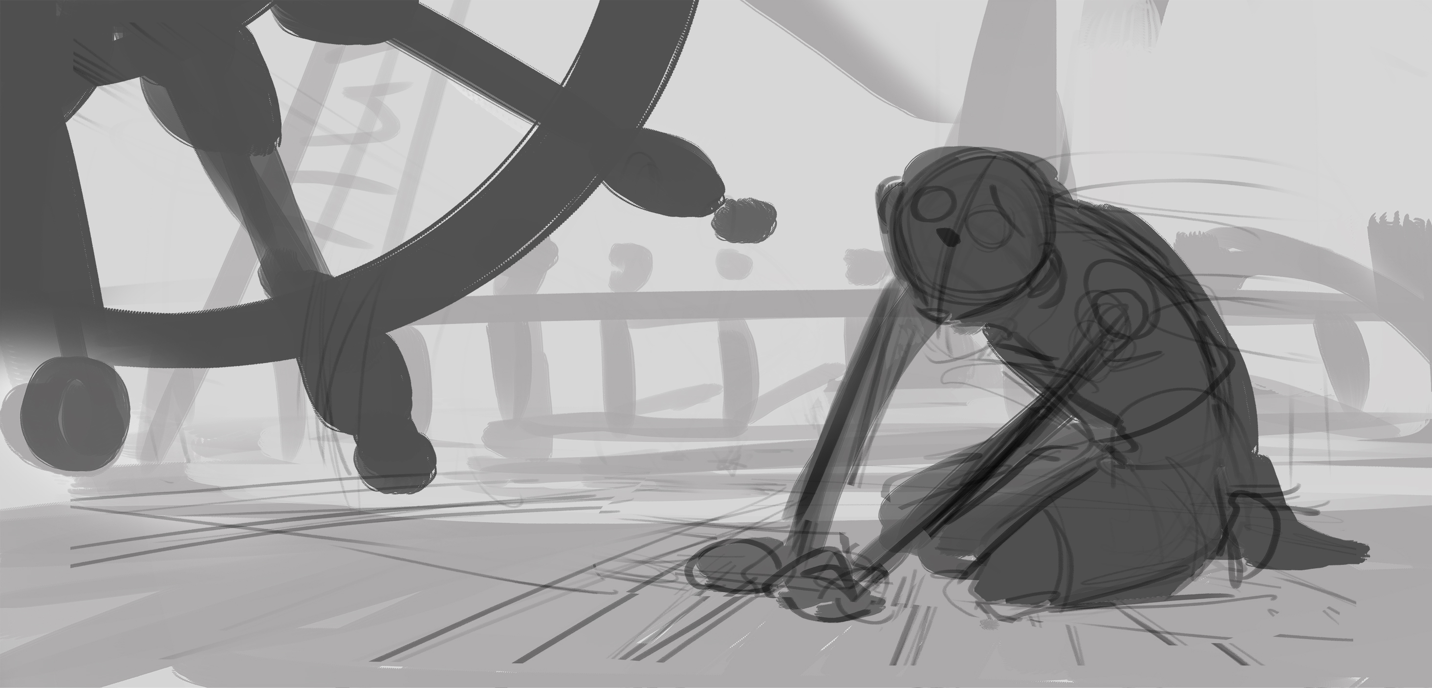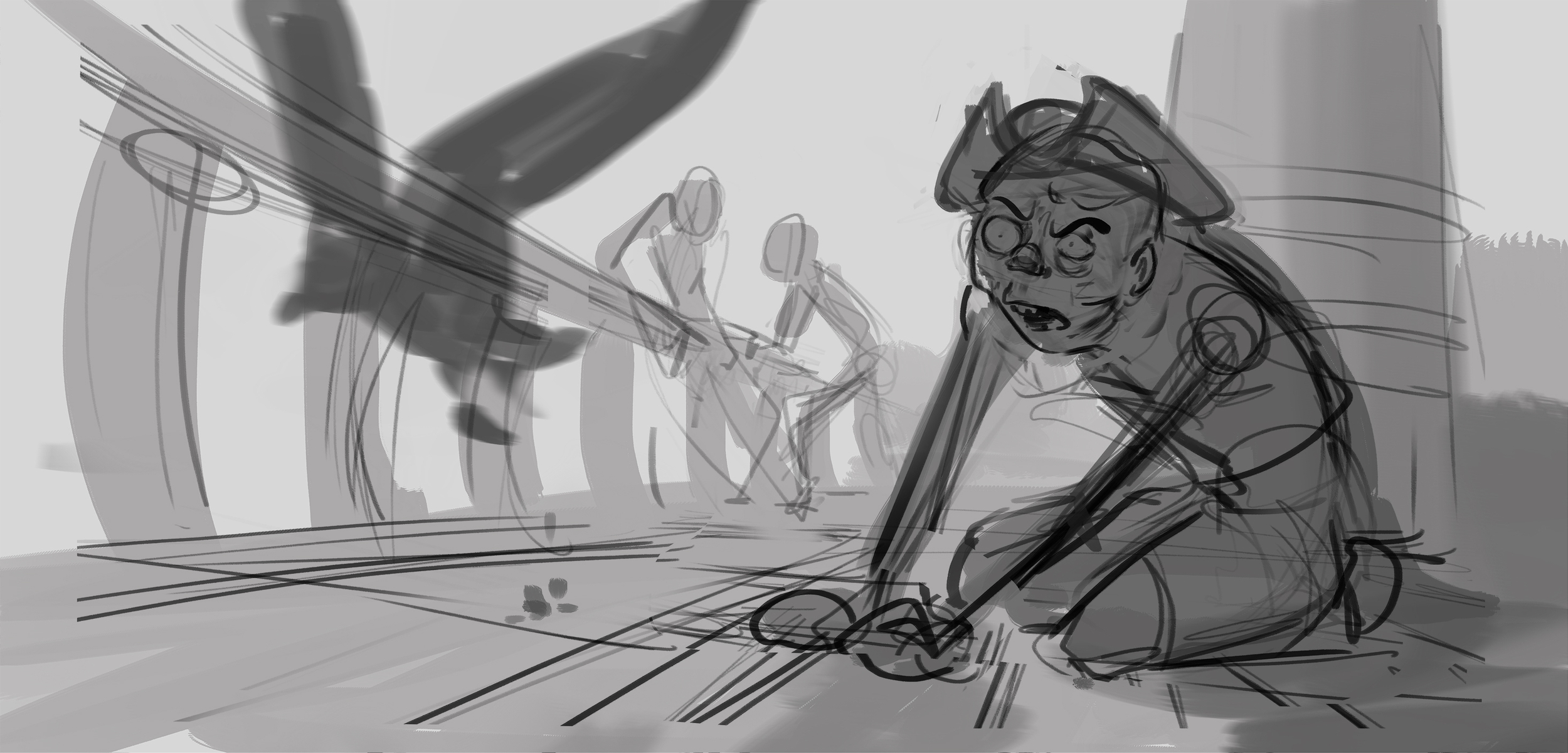 Bonsoir à tous! Je me suis dit, je vois pas beaucoup ce personnage alors allons-y! J'ai pensé d'abord à un personnage mélancolique qui regarde le large, imaginant quitté sa prison maudite. Mais pas facile à faire comprendre, j'ai pensé à un regard blasé qui regarde la barre du bateau. Puis après je me suis dis, un peu d'humour aussi! L'idée suivante est de voir une mouette passée qui lâche sa fiente devant lui, avec en fond des pirates qui rigolent comme dans le pitch du challenge. Alors mon coeur balance, soit il est blasé soit il râle , j'arrive pas à choisir 😄 Bon dessin à tous!
