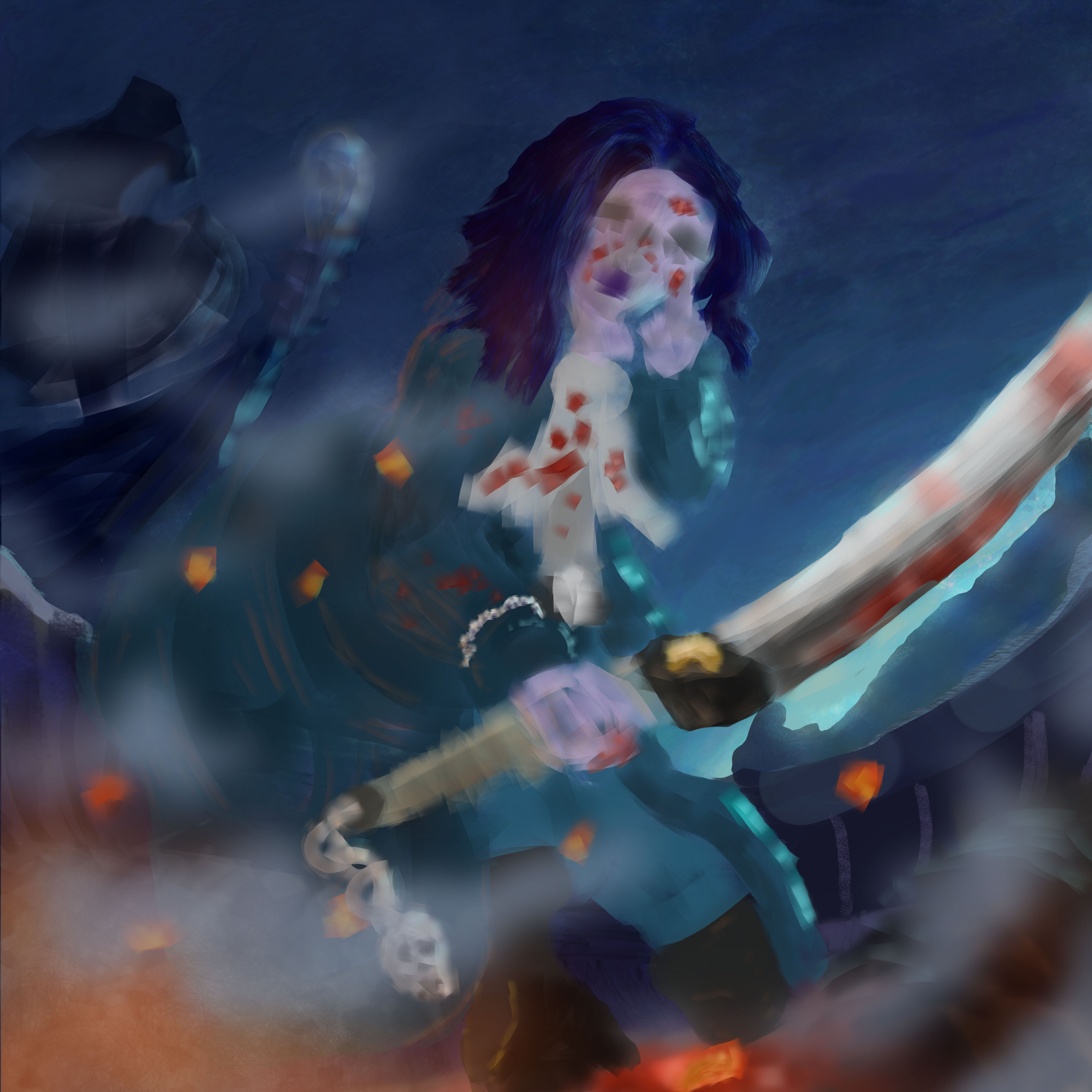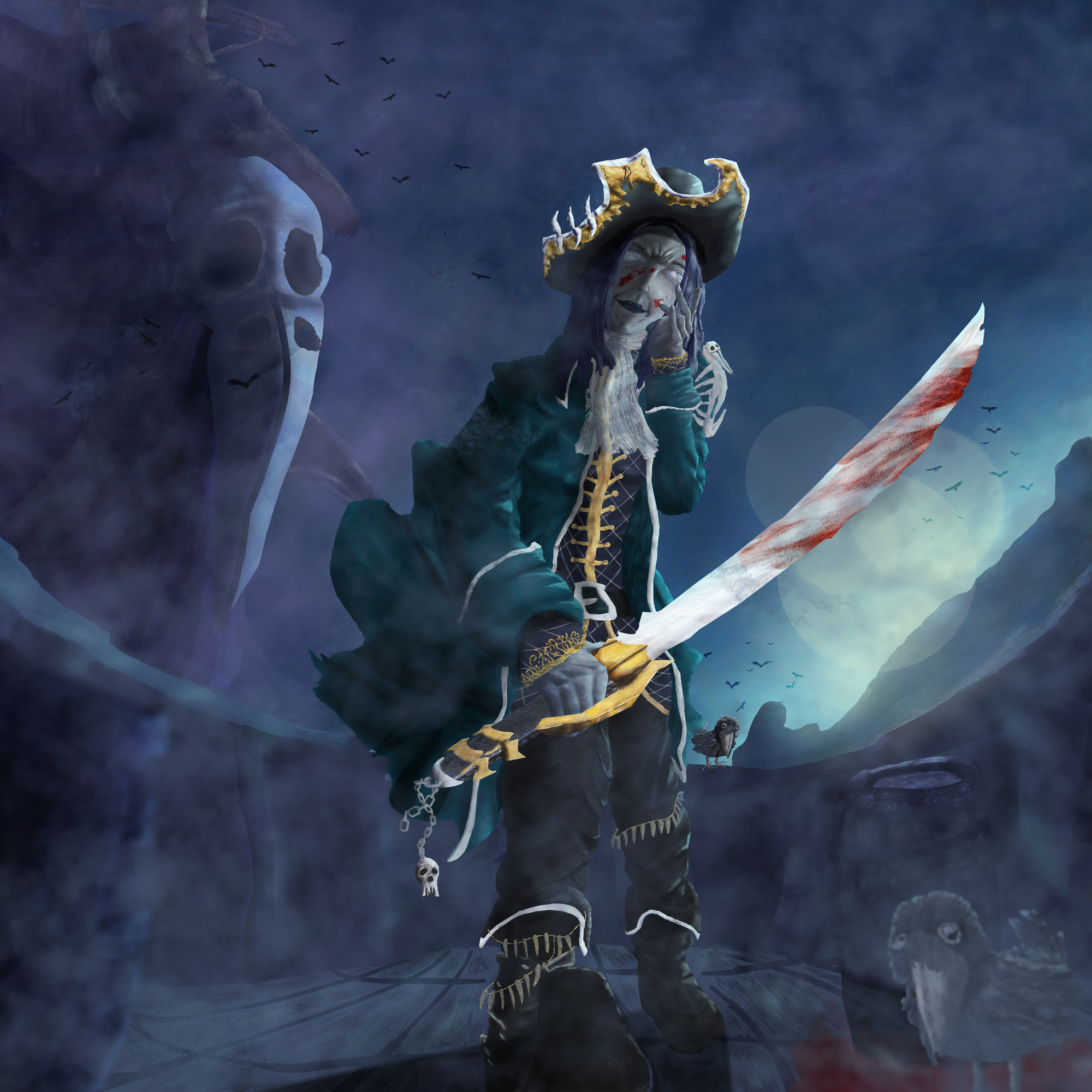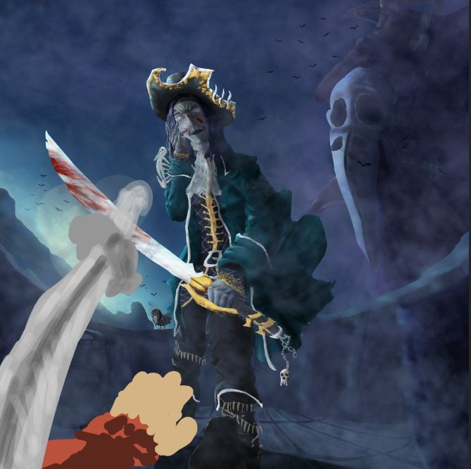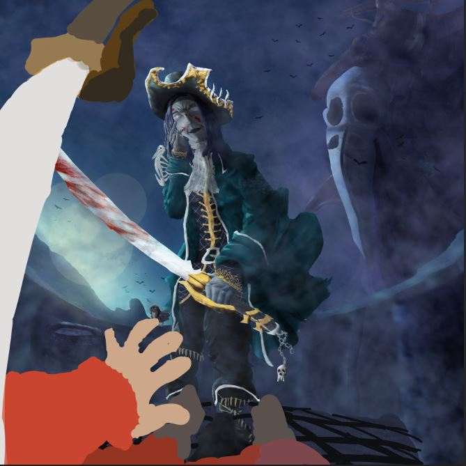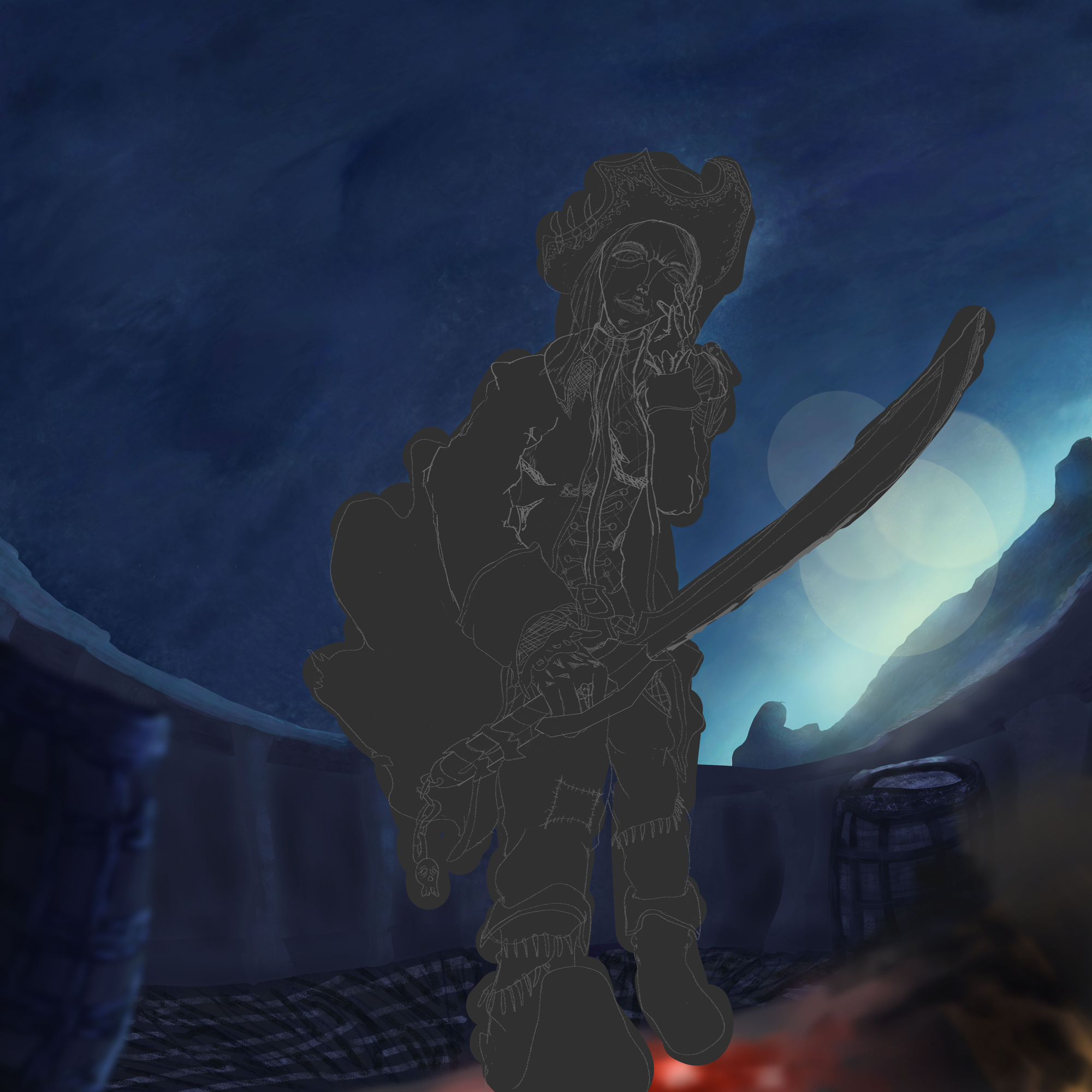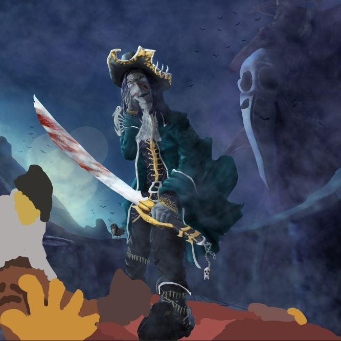 Pour ma 1ère participation au challenge, j'ai choisis la capitaine du black bones. Je me suis clairement écarté du brief, je voulais une représentation moins fantastique, n'ayant pas les compétences pour faire aussi bien qu'un Davy Jones de Pirate des caraïbes. J'aimais l'idée que le personnage ai façonnée elle même sa propre légende, avec une attitude cruelle, déshumanisé, des ornements inspirants la terreur, sa ruse, son don de la mise en scène et ses talents d'épéiste évidement. Du coup j'avais déjà une scène en tête, petit matin, une attaque de navire, de la brume pour qu'elle puisse surprendre ses adversaires. Je suis directement partis sur des speedpaints pour me donné une idée de ce que ça pourrais donné en terme de couleurs et de composition. Je suis pas super content du résultat mais au moins j'aurais une image finale à proposer. Je suis ouvert à toutes critiques, j'espère en avoir, même si vous n'avez pas l'expérience, un simple "ça fait un peu bizarre là" ou bien "je suis pas sûr que ça devrait être comme ça", je prends quand même. Merci d'avoir pris le temps de lire ce post et bon painting à tous.