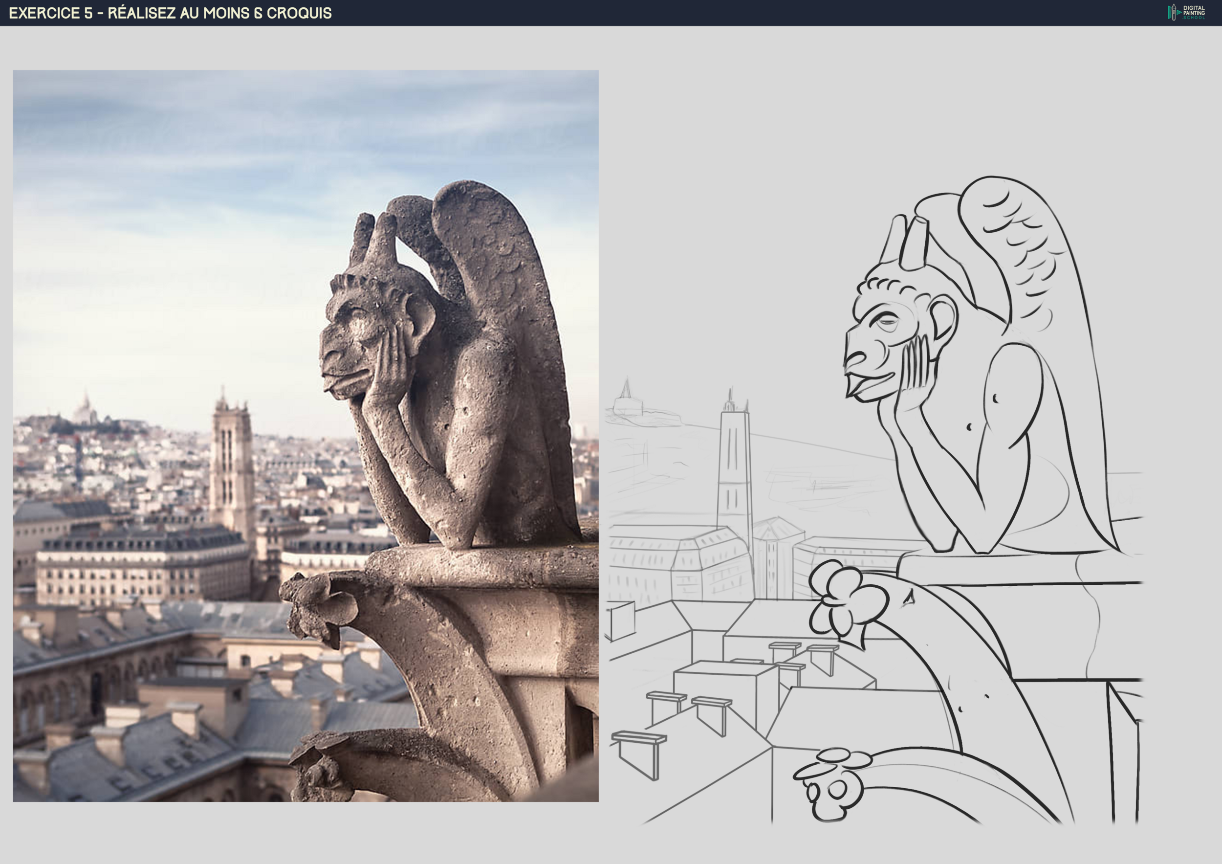 Me revoilà avec un update de ma gargouille ! Donc je suis revenu en arrière pour ajouter l'arrière plan : les immeubles à gauche, réalisés avec l'outil trait (un peu rigide tout çà et tellement chronophage), puis derrière, d'autre immeubles avec la tour puis tout au fond, la skyline avec Montmarte. j'ai joué sur la taille du trait et du niveau de gris pour bien détacher les plans, genre 'perspective atmosphérique'. Un petit retour avant de passer aux hachures ?? Merci par avance -