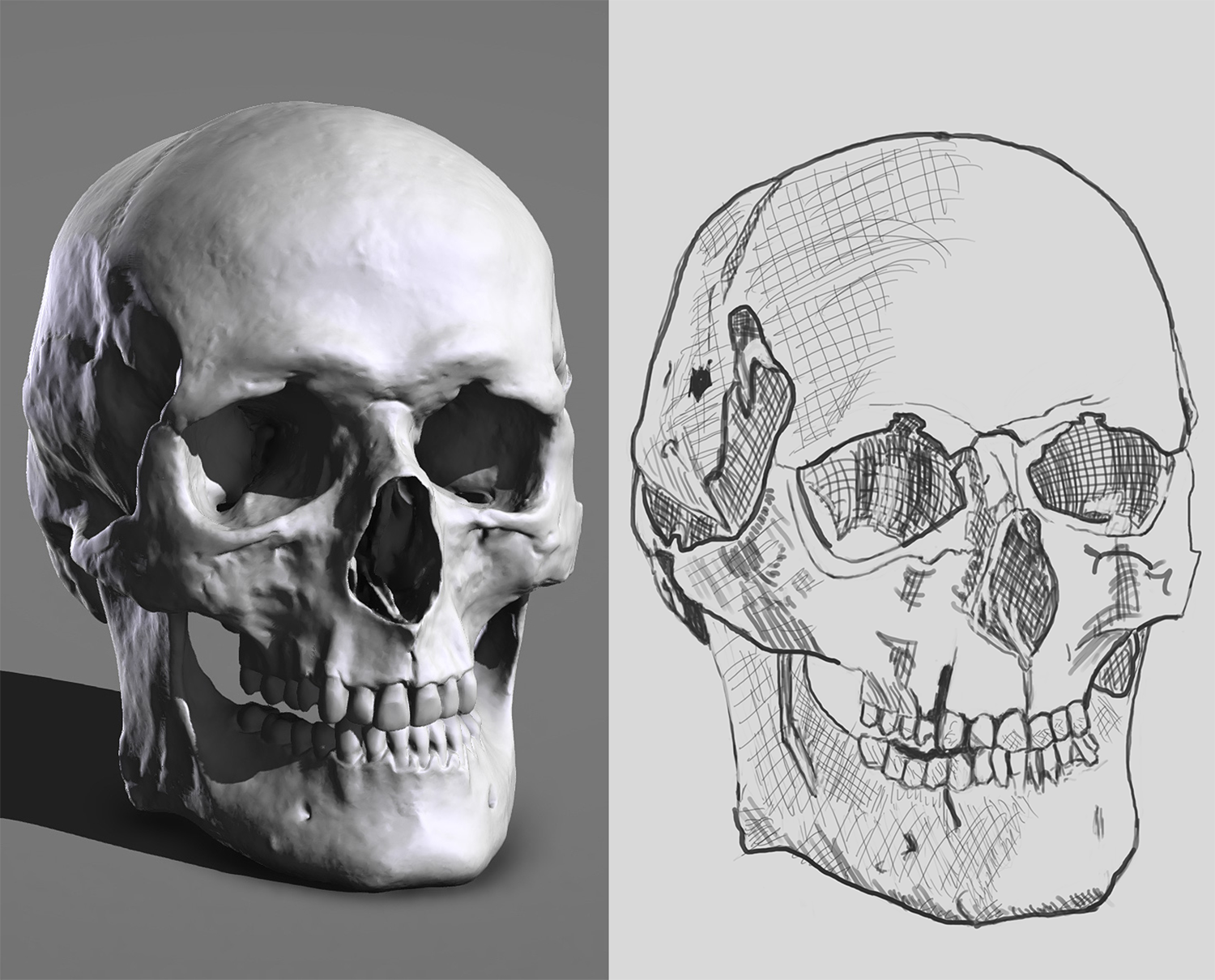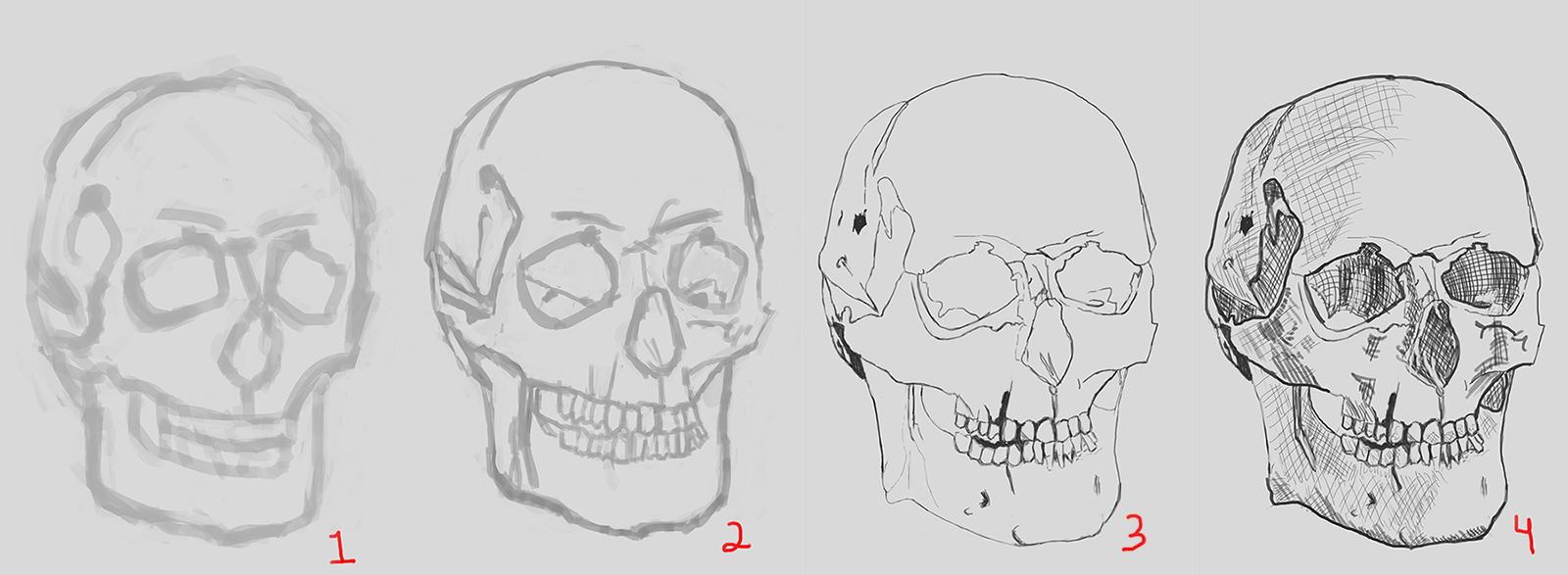 Exercices croquis crâne: Je connais la convention des hachures. J'ai essayé de respecter au moins les valeurs.