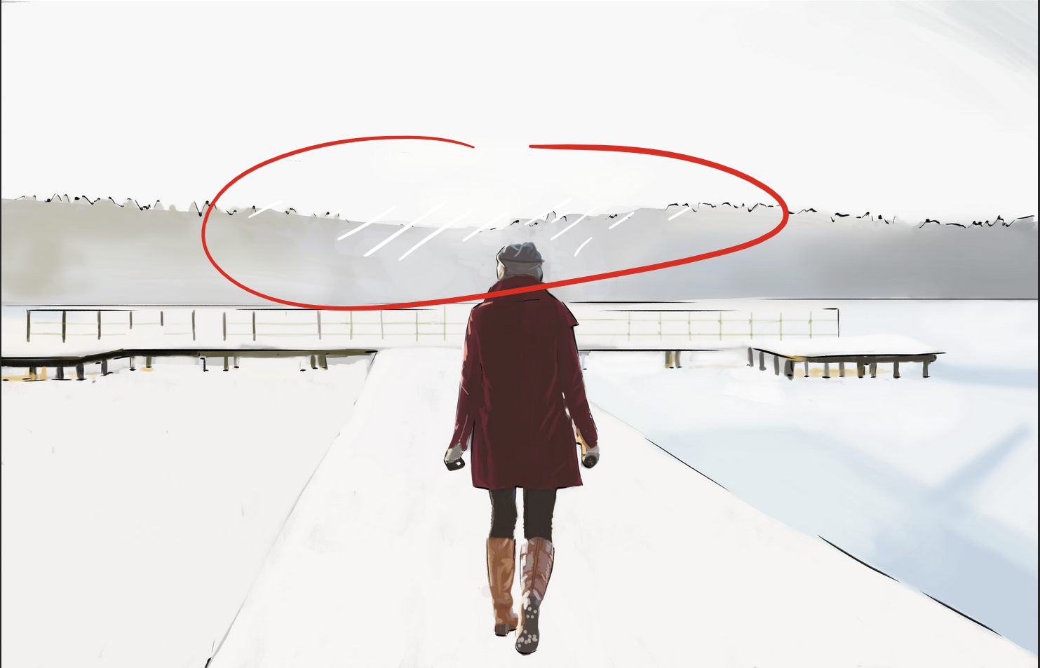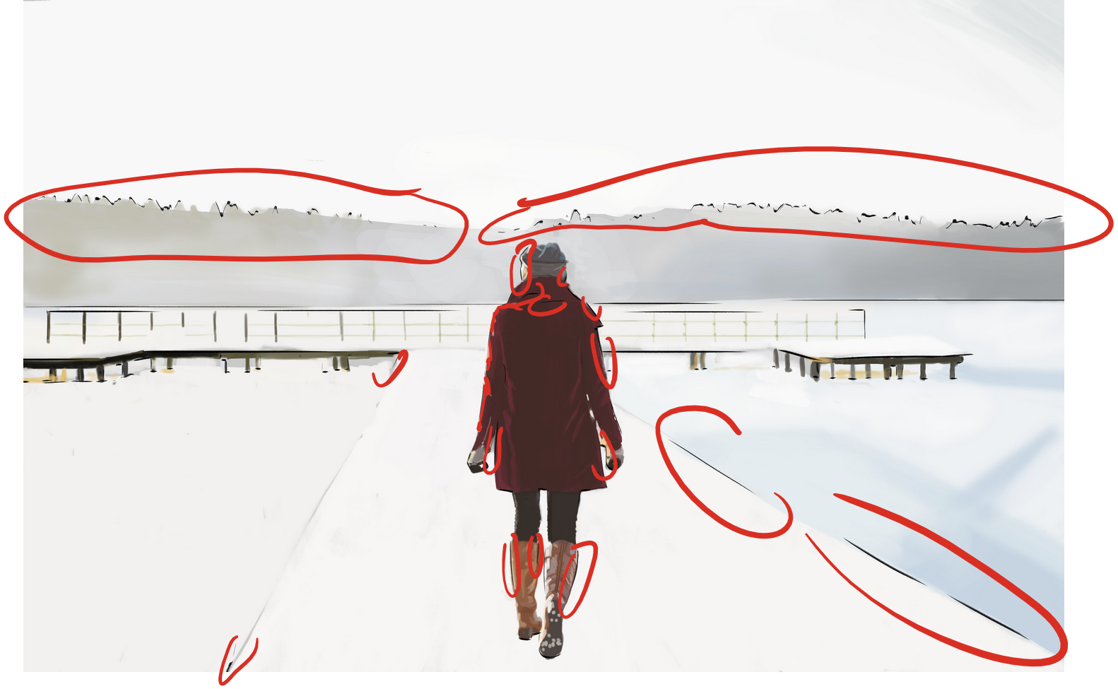 Hello @dododurio ! Franchement c'est pas mal du tout ! La base est solide. Juste je pense qu'on peut largement se passer des contours noirs. ça rend l'image un peut sale c'est dommage. Tu peux aussi légèrement atténuer les éléments très contrastés dans le background. Ainsi que marquer d'avantage la rim light (en êtant le plus précis possible par rapport à lka ref) sur la manche (et le bonnet mais à la rigueur c'est le moins grave, c'est déjà assez bien fait). Hésites pas non plus à légèrement atténuer la silhouette de la cîme des arbres au centre. Bon courage ! ça part bien !