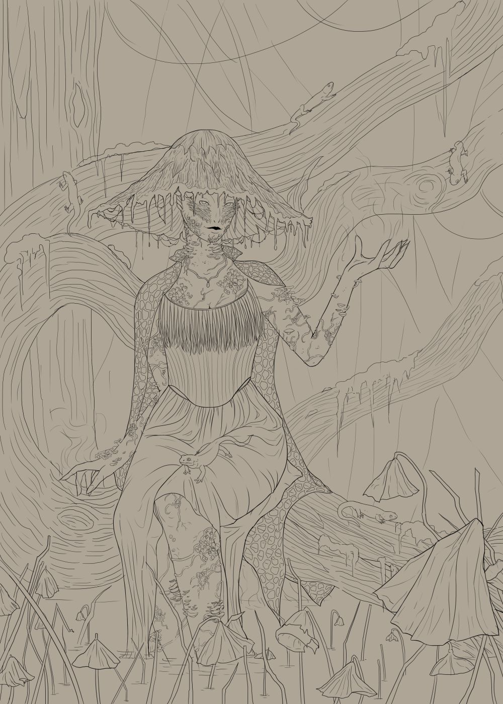 Alors voilà, pour le contexte, j'en suis au chapitre 2 de la formation, j'ai fait une pause de quelques jours car j'attends une réponse pour le financement et je ne voulais pas avancer trop vite dans la formation pour éviter d'arriver au bout de la partie gratuite et me retrouver avec un "vide". Bref, une histoire de motivation et tout ça. J'ai donc pris l'initiative de me lancer dans un dessin dont j'avais eu l'idée un peu plus tôt. Ça a été l'occasion de faire de nouveau le point sur mes limitations techniques (gros problème de perspective qui m'a fait refaire une partie du dessin, anatomie du personnage humain, visage, main, lignes, etc.) comme physiques (retour d'énormes douleurs et contractures au niveau de l'épaule et du trapèze alors que je m'acharnais sur le dessin). Bref, ça a été instructif, intéressant, ça m'a demandé d'étudier certaines choses de par moi-même, mais ça a aussi été douloureux et va sans doute me demander de me reposer si je veux continuer à dessiner car là c'est devenu un calvaire de douleur. Je suis arrivé à bout de ce que je pouvais faire sur ce dessin donc je le poste ici.