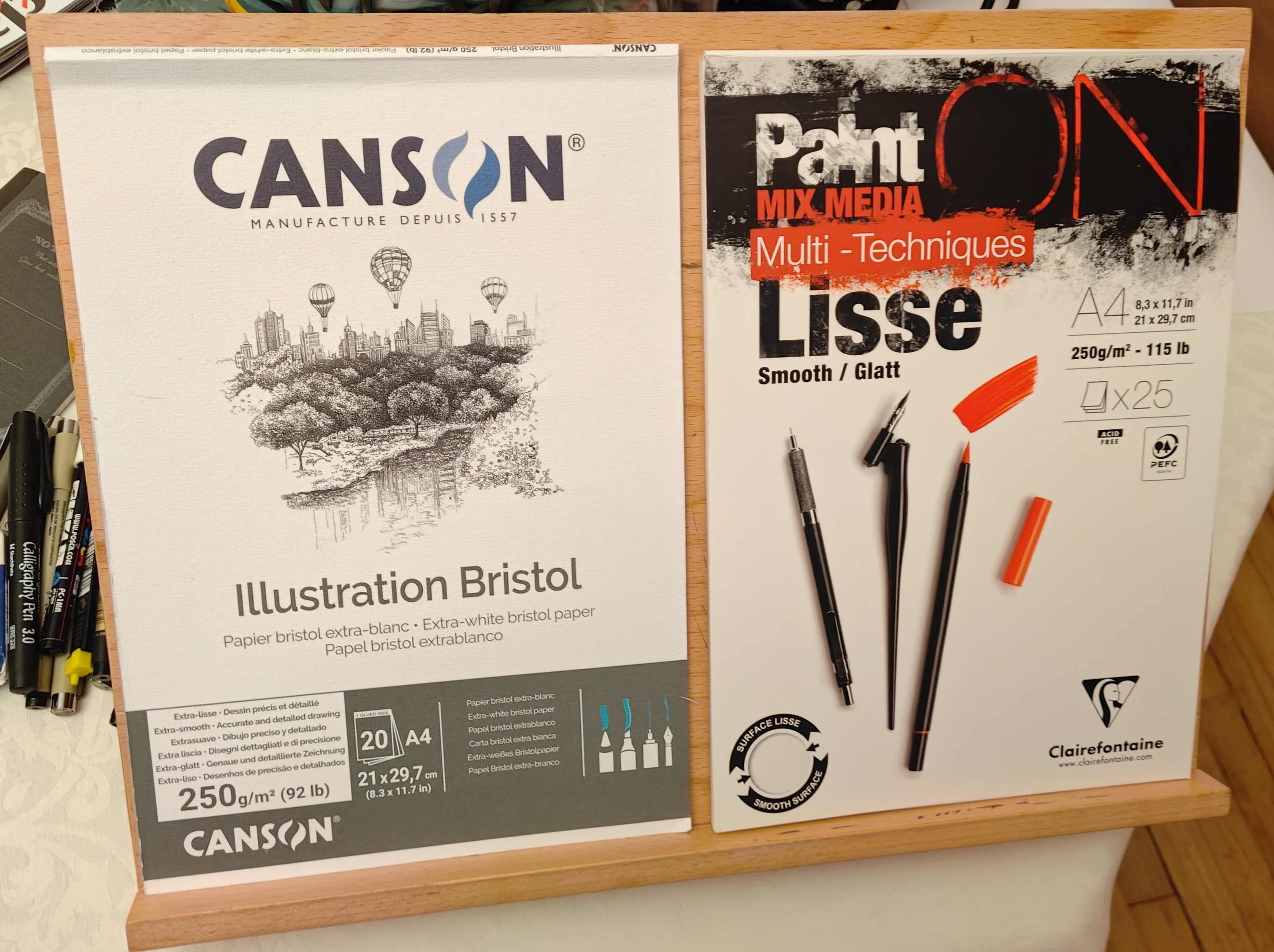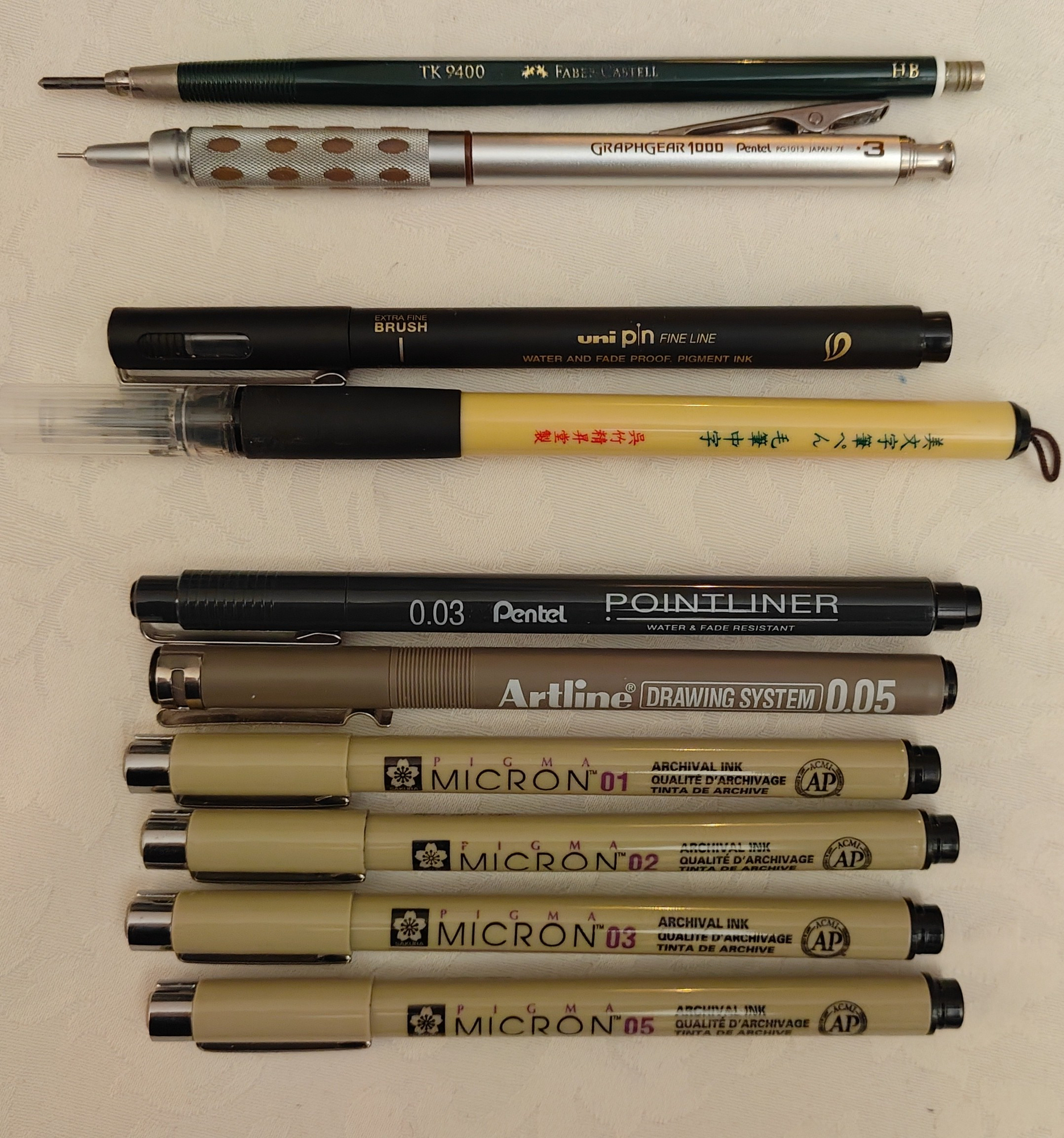 @yurinomai Si tu veux. En premier lieu, je fais toujours une base au crayon papier pour placer les éléments, puis un criterium pour préciser les traits et ajouter les détails. Et enfin, je passe à l'encrage. J'utilise deux stylos brush, une pour les petites surfaces et le détail, l'autre pour les grosses zones à assombrir. Oh, et, un bon chevalet de bureau, pour être le plus confortable possible durant le dessin. Pour les photos, voici ce que j'utilise comme matériel. Le plus souvent, pour l'encrage, j'utilise les tailles 0,03, 0,05, 01. -