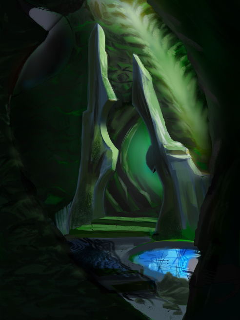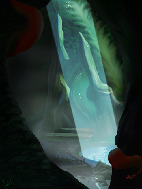 j'ai ajouté de la brume, la lumière de la lune qui tape dans la flaque d'eau, les tentacules qui s'agrippent sur les roches du 1er plan, et j'ai un peu joué avec les effets finaux (courbes, teinte/satu, un léger dégradé vert/bleu). je pense que mon enviro est fini, mais j'attends quand même encore quelques jours avant de le poster pour me "nettoyer" les yeux