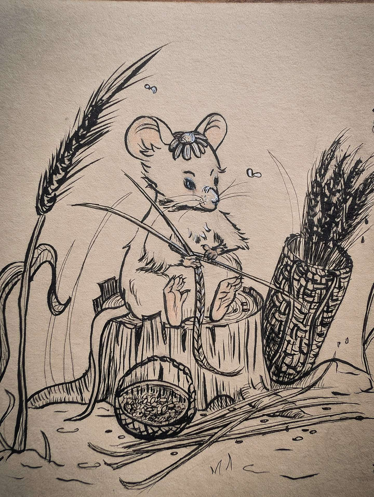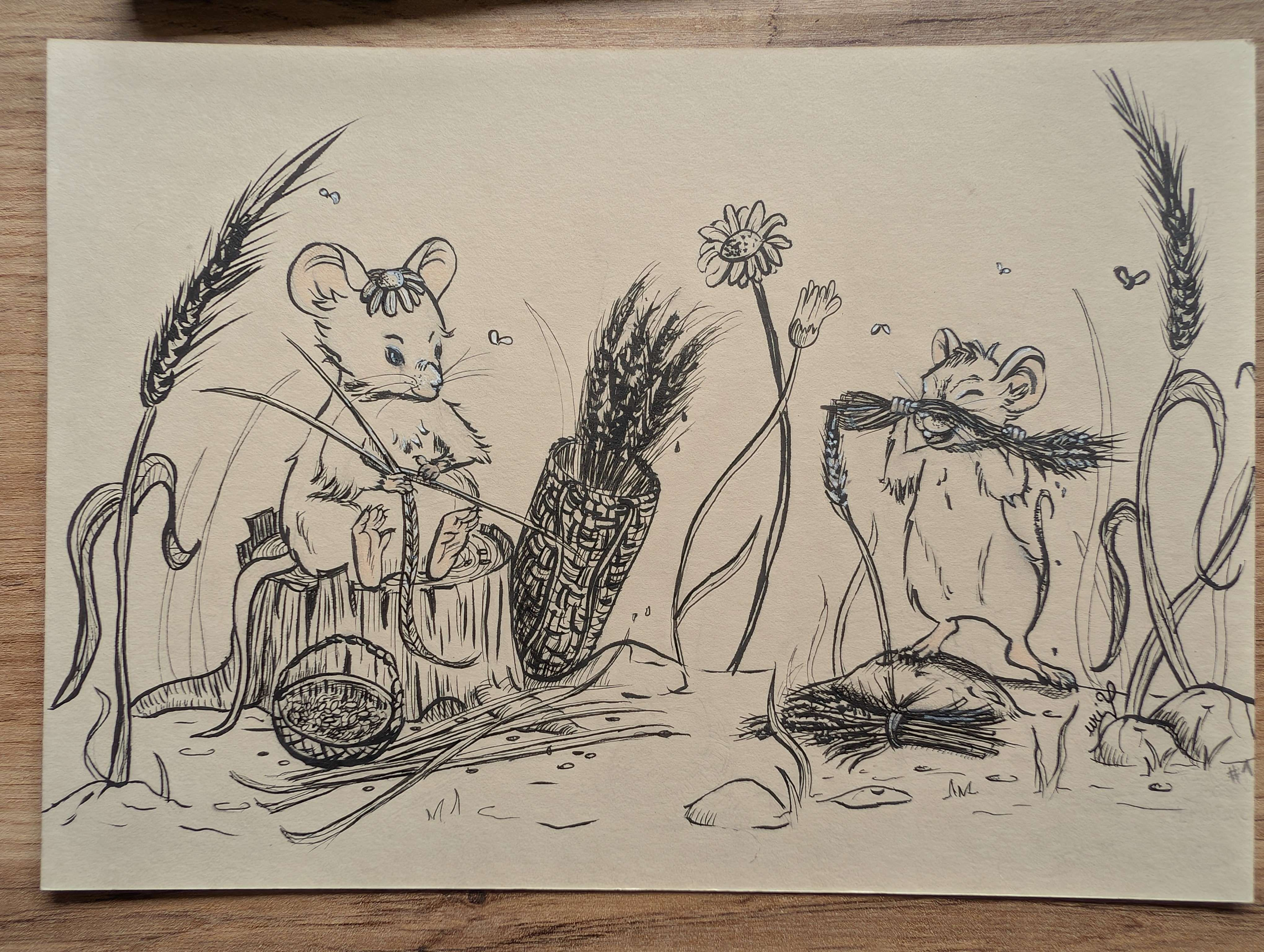 4. Bonjoour ! Mon stress en postant était d'imaginer le nombre d'araignées que j'aurais à affronter. 😅 De mon côté, on poursuit avec le thème des souris des champs. Et on ajoute ce merveilleux art qu'est la vannerie ! (Mon téléphone n'était pas très docile aujourd'hui pour les photos). Et la photo de famille (j'avais gardé la place à côté exprès, héhé). @Shelter Aha, c'est original ma foi ! @HaeresisJ'ai la ref, super bien trouvé ! @holdwigOh bah cette araignée si choupi me va bien, tu vas me réconcilier avec elles peut-être ! EDIT : Je suis en expérimentation totale avec l'encre et mon pentel, alors s'il y a des chevronnés de l'encrage, n'hésitez pas à donner vos conseils (j'ai notamment peur d'aller trop loin dans l'ombrage/texture et tout ruiner).