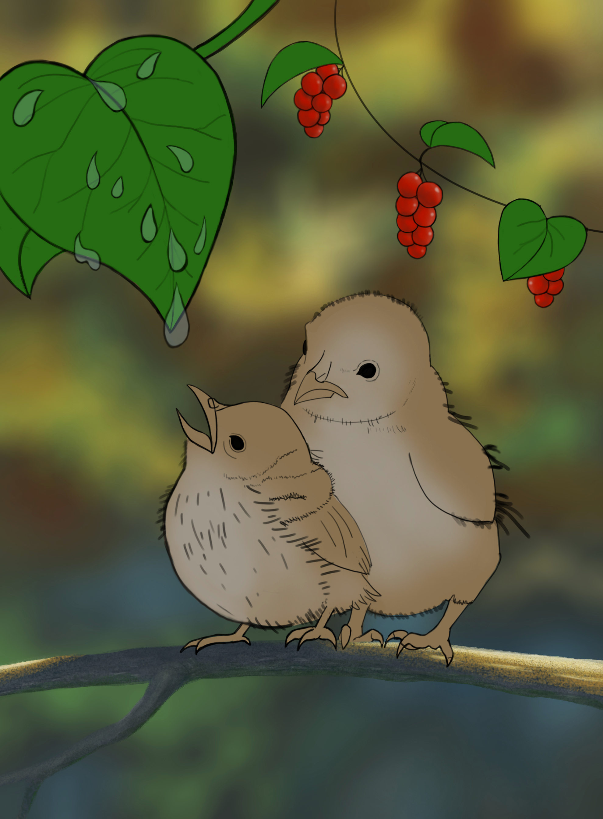 Merci @kyuare! Je prends bonne note de ton conseil. Il est évident que je n'ai pas l'habitude de penser en volume car je n'ai jamais dessiné qu'avec des lignes et sans couleur, sans lumière, et mes dessins ont toujours été très "plats". Bref, je vais essayer de garder ton conseil en tête. Ces jours-ci, j'ai aussi réfléchi à comment avancer dans ma démarche sur mes projets et ma recherche d'un style personnel. J'ai pensé que je pourrais déjà rassembler des images des artistes dont le style me plait. Ça serait une base pour m'inspirer. Penses-tu que c'est une bonne idée ? J'en profite pour poster l'exercice suivant, celui des oiseaux. Comme conseillé dans le sujet où j'avais posté la branche, j'ai enlevé la lumière sur la branchette. J'ai aussi pris la liberté de rajouter quelques baies rouges car la plante m'en a rappelé une que je connais et qui porte ce genre de fruits (très toxiques d'ailleurs). Et comme j'ai une petite passion pour les plantes, ça m'a donné envie de rajouter ce détail. Si jamais il te semble que ça parasite l'image ou le focus sur les oiseaux, j'enlèverai les baies. Elles sont sur un calque séparé. J'espère que l'image dans son ensemble est ok. En ce moment, on m'a donné de nouveaux médicaments pour mes insomnies et ça me met la tête un peu dans le coton. J'ai du mal à avoir du recul sur ce que je fais. (D'ailleurs je vois que certaines baies manques de rondeurs, je corrigerai ça un peu plus tard).