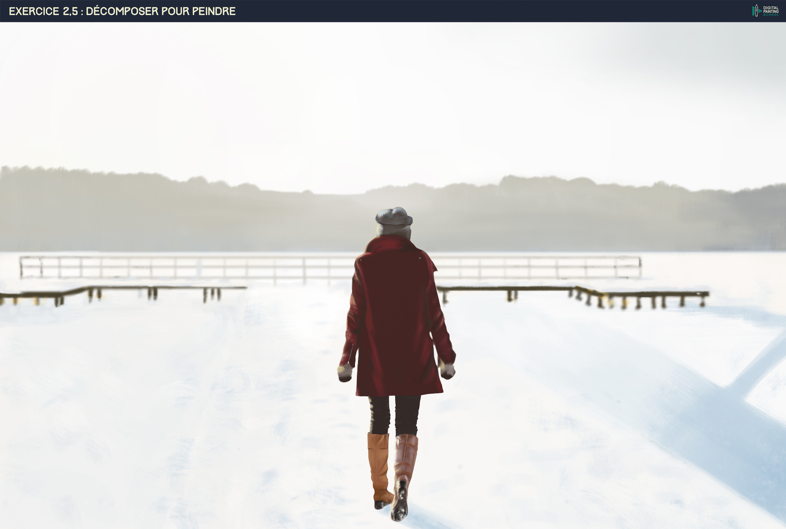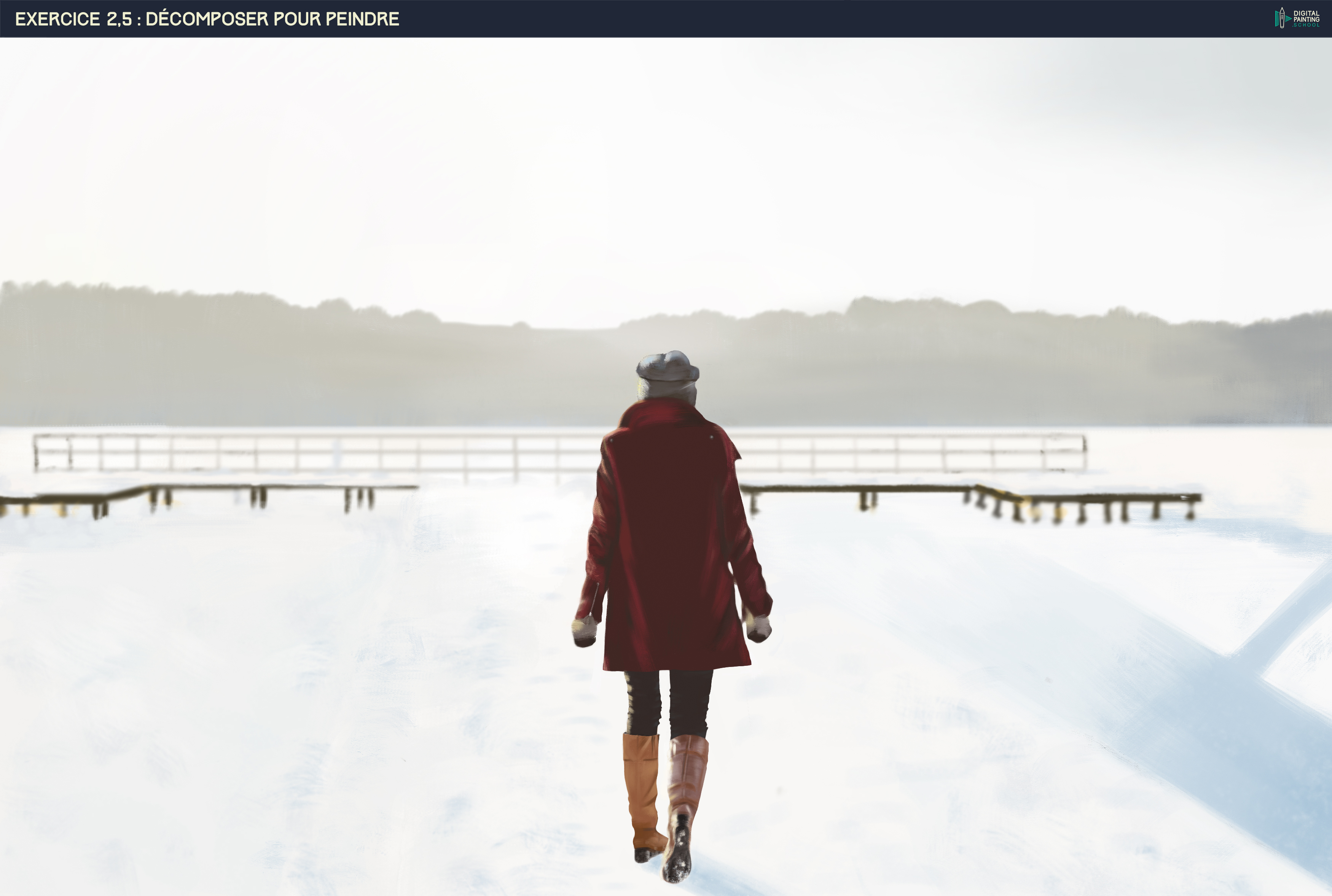Hello ! Ravi de que tu aies apprécié l'utilisation de ces outils ! 🙂 Pour ce second exo, c'est très bon travail ! Juste quelques éléments sont améliorables pour une meilleure intégration : - Attention à ne pas laisser un rendu en brush douce qui se voie un peu trop. Au niveau du haut de la porte par exemple, les trais foncés de contraste qui sont les détails de la porte sont effacés, il faut essayer de garder ces zones de contrastes. Idem pour les petits carrés des détails de la porte dans la lumière qui sont un peu effacés. - Tu as un petit liseré plus clair entre la jointure du mur et du sol, essaie d'avoir une jointure sombre du bas du mur avec le sol. - Attention de ne pas trop s'éloigner trop en terme de couleurs pour l'intégration l'architecture est un peu trop jaune dans les ombres par rapport au fond bleuté de la montagne. Soit bleuter un peu les ombres de l'architecture, soit désaturer un peu les ombres de la montagne. - Essaie aussi d'accentuer un peu les bords de la montagnes pour suivre un peu la pers de la porte vraiment vu de dessous. - La neige dans la lumière est un peu trop saturée par rapport à la saturation de la porte dans la lumière.