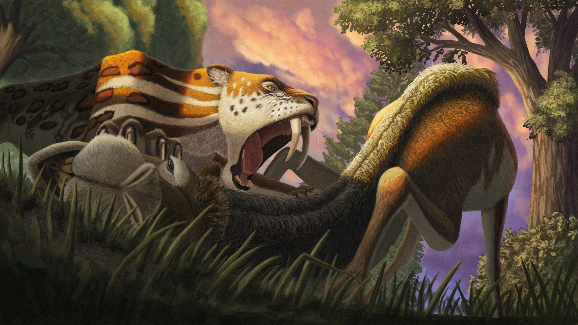 Pas de dinosaure cette fois-ci, mais le plus célèbre tigre à dents-de-sabre, Smilodon fatalis, en train de plaquer le cou et la tête de sa proie, un chameau occidental (Camelops hesternus). Pas besoin de plaquer le corps entier de sa victime, tant que la tête est suffisamment immobilisée pour que le félin puisse lui planter ses célèbres canines.