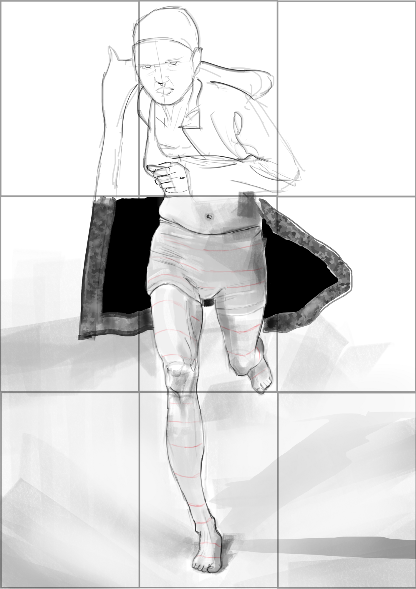 Salut ^^ Plutôt réussi ce premier exo, attention ici on a comme une forme de triangle avec des bords plutôt net à droite et à gauche en bas et plus soft en haut, pas évident cette forme ^^ Le reste c'est plutôt réussi malgré quelques petites différences au niveau du contour des formes. Ah oui les répétitions c'est pas simple ^^ Dans l'ensemble c'est plutôt pas mal, je pense que ca manque un peu de rouge vif côté lumière sur le bord du manteau. Et sinon peu être un peu de texture de pas dans la neige au sol pour qu'on comprenne un peu mieux que c'est le sol, faut pas hésiter à ajouter un peu d'ombre sous ses pieds. D'ailleurs au passage tu remarqueras que l'ombre est d'avantage bleutée que grise. Bon courage !