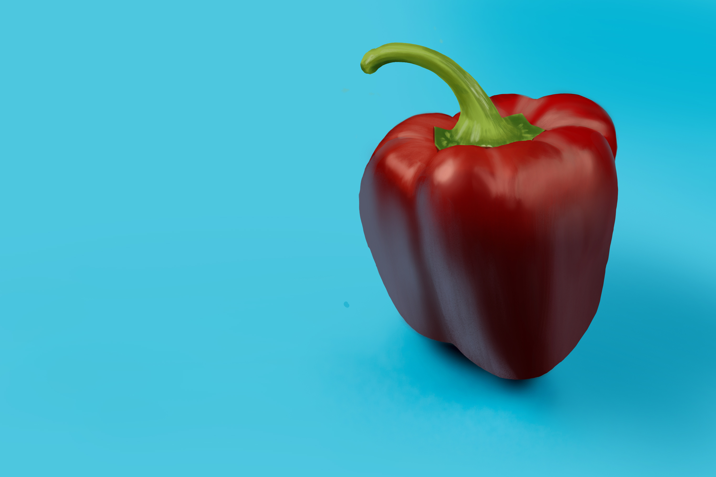 En me servant de ton exemple, et en mettant directement l'image de référence sur mon Photoshop, je m'aperçois qu'en effet les couleurs surtout pour la rose ne sont pas suffisamment saturées. C'est un point que j'ai corrigé pour retoucher le poivron, la partie ombre de la rose, j'ai bien conscience qu'il faudrait refaire toutes les parties peu saturées mais j'ai envie d'avancer un peu. J'espère que ca n'est pas bruler des étapes. -