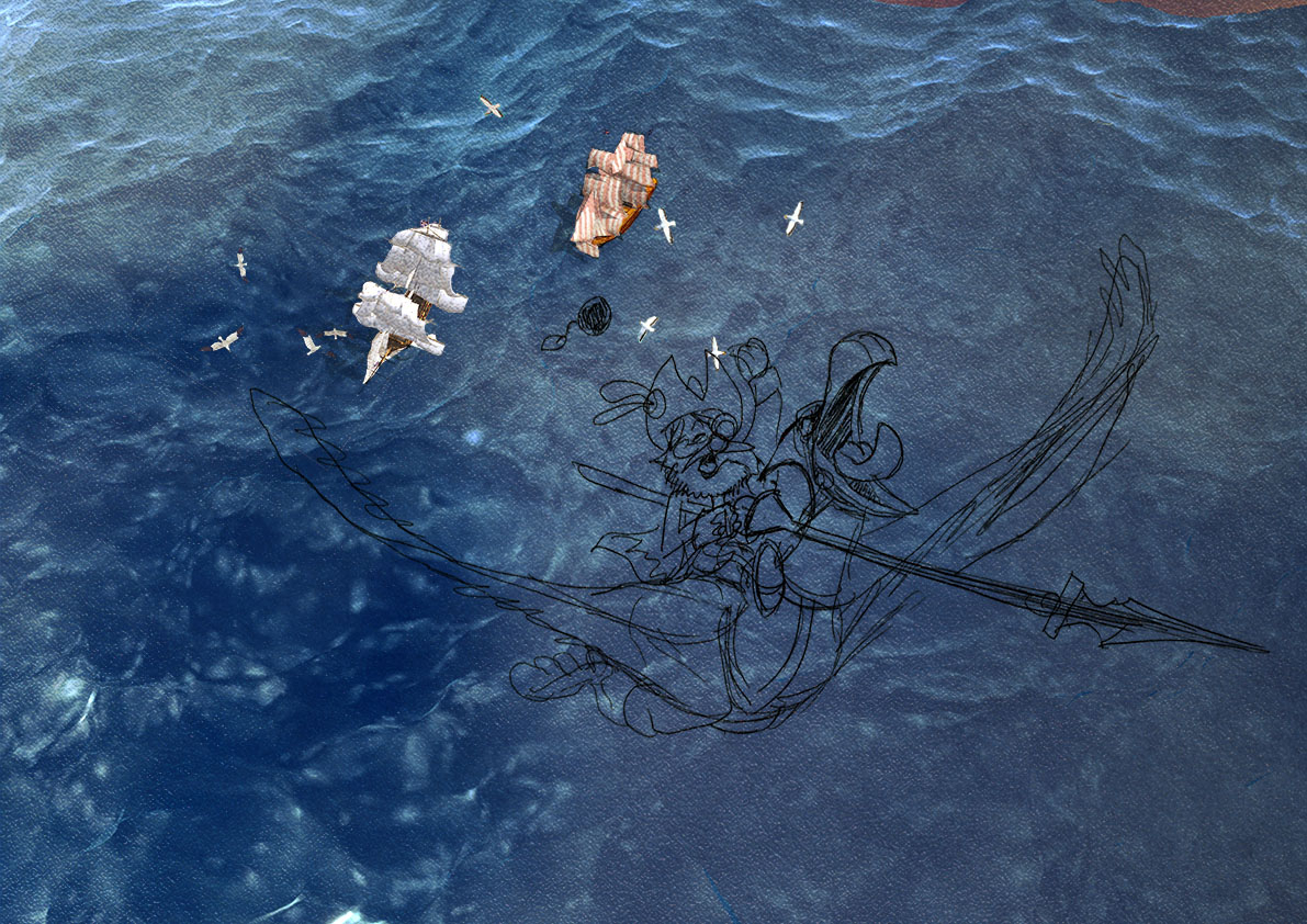 Je me suis avancé un peu sur mon fond. Finalement je vais faire une vue aérienne avec deux bateaux en dessous, en feu du fait des bombes lâchées par le pirate qui remonte tel un avion de chasse. La mer ne restera pas plastique c'est juste pour me donner une idée