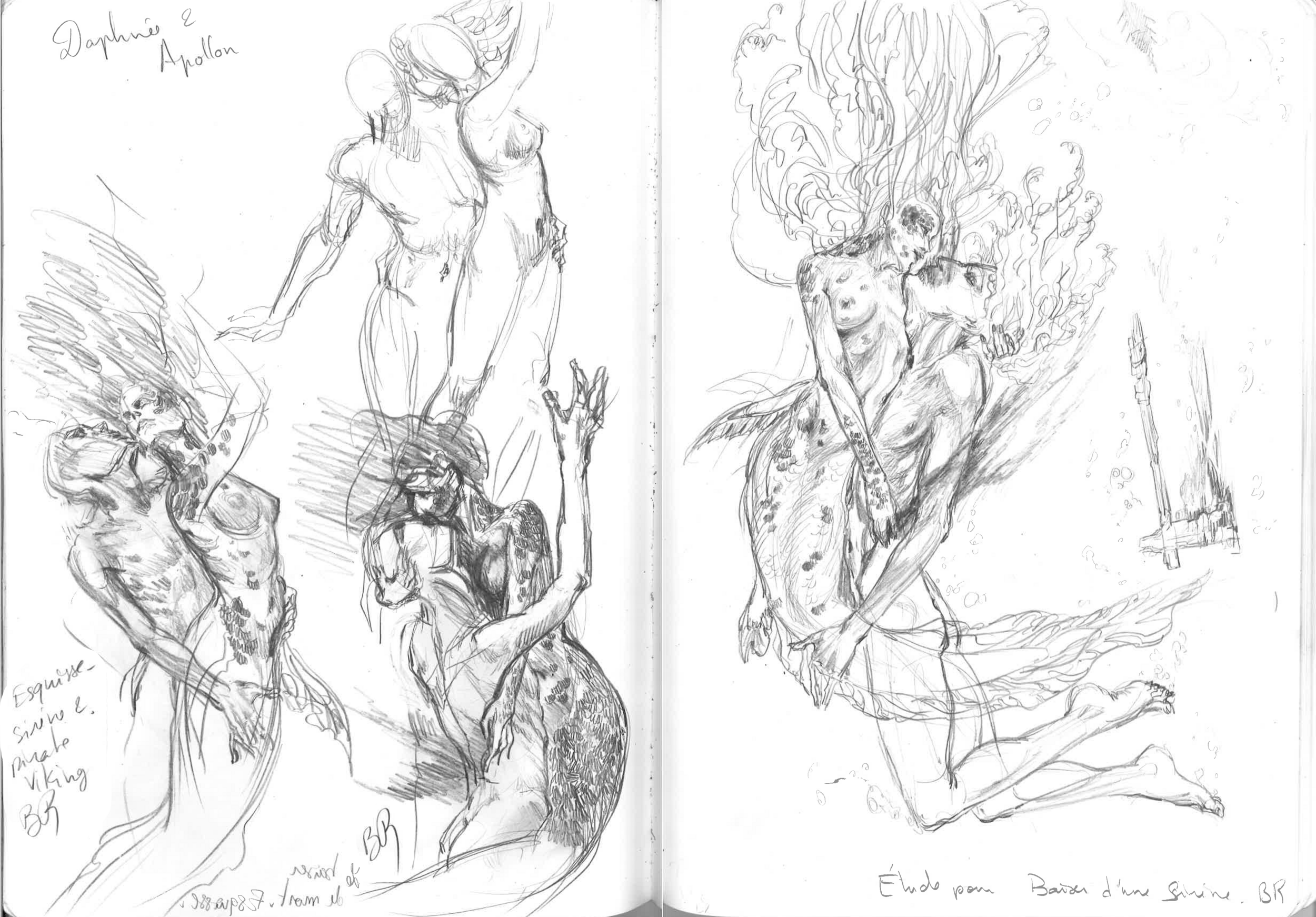 Bonjour à tous, Voici quelques esquisses pour une idée de concept/illustration dans le cadre du challenge #20. L'idée est de montrer les derniers instants d'un pirate viking, recueillis par la Sirène ensorceleuse des eaux froides et noires. L'homme est blessé à mort, agonisant, mais un dernier éclat d'Amour se révèle entre ces deux "monstres" : la créature maudite qui voit les marins séduits mourir entre ses bras et le meurtrier sanguinaire aux mains rougies par le sang. Le baiser est l'instant du dernier soupir. Comme vous pourrez le voir avec le croquis d'étude de Daphnée poursuivie par Apollon , je me réfère pas mal aux sculptures et statues de couples pour trouver une pose tragique et pleine de tension dramatique. J'ignore le temps que j'aurai à donner à ce projet, mais j'espère produire au moins une belle image finale 🙂 Tschüss, Bluenn. Fun fact, j'ai dessiné la hache avant de lire les briefs des personnages vikings, heureuse coïncidence : >