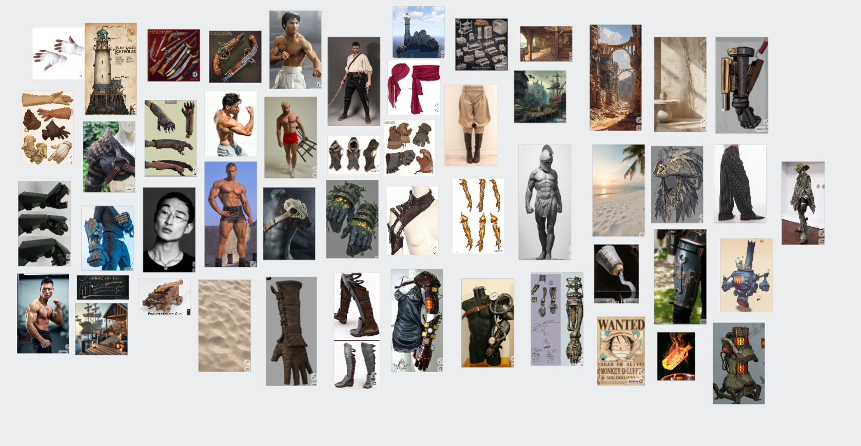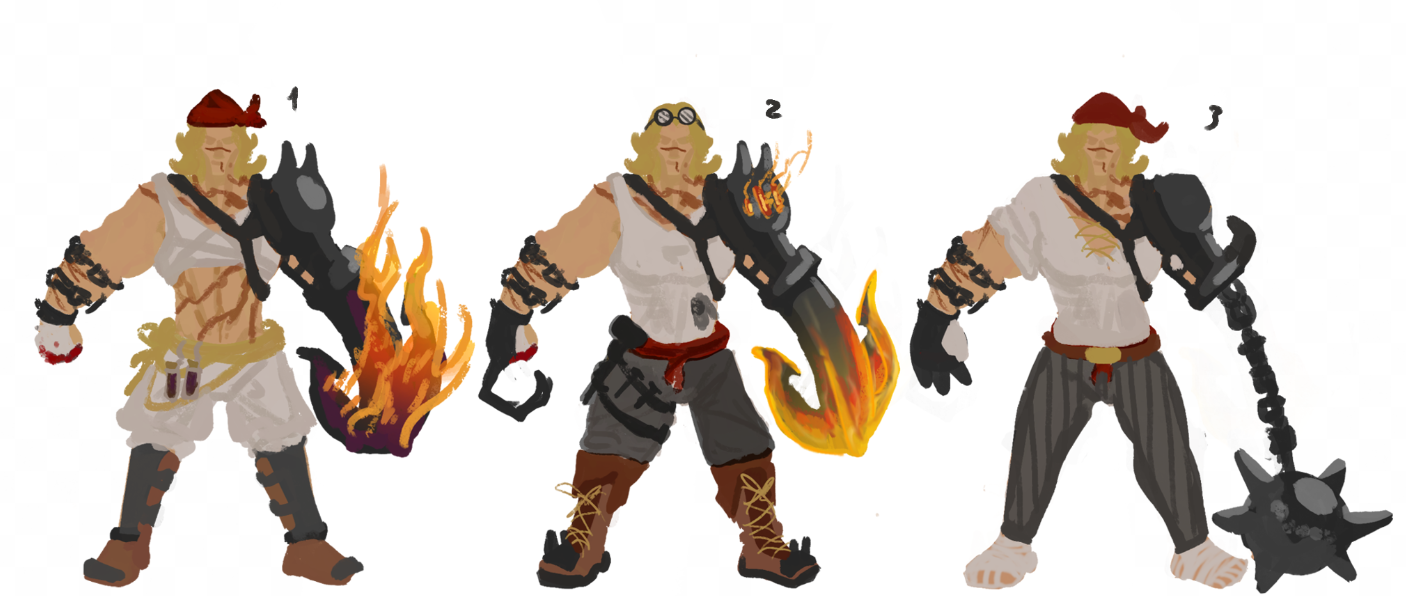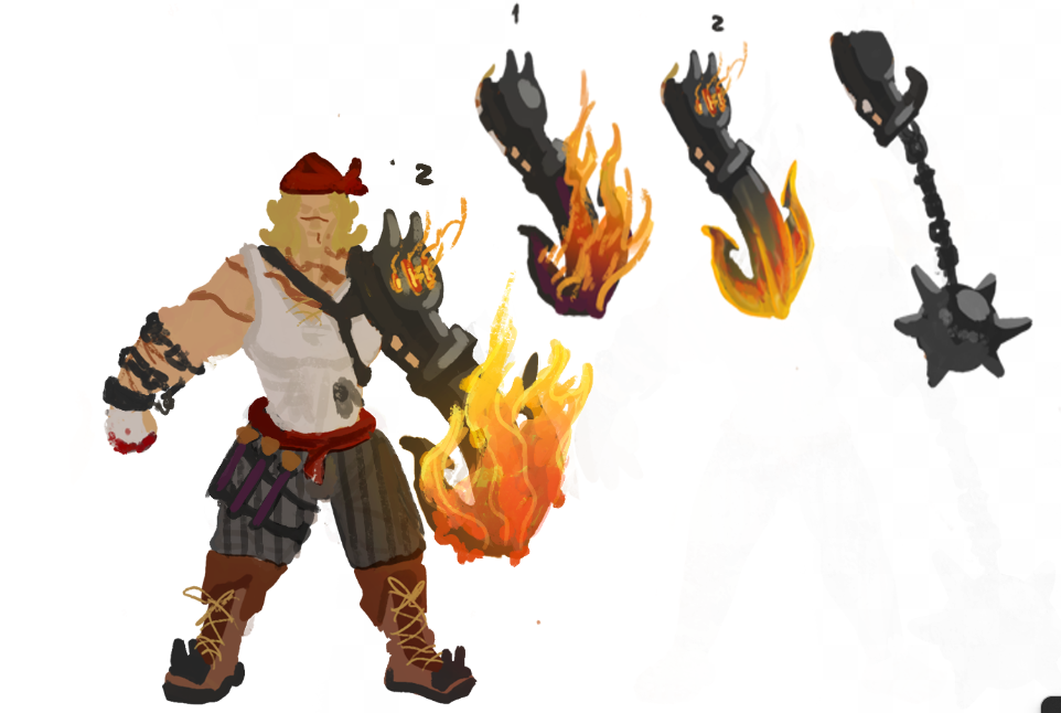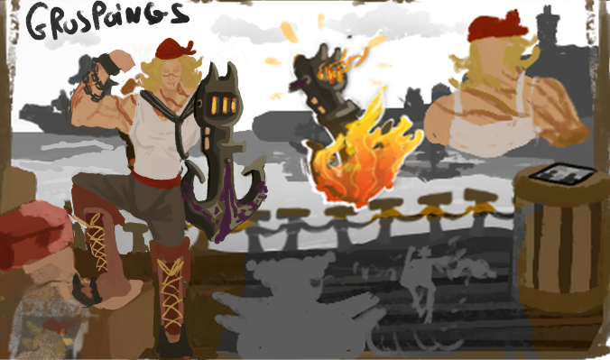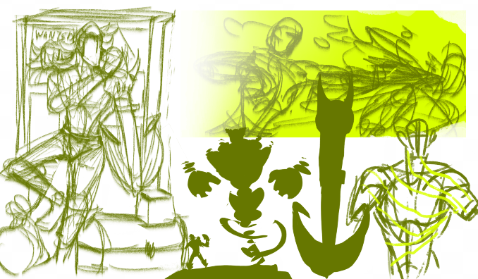 Je n'ai plus l'original dans la disposition et les dossiers, mais c'est l'équivalent. Tout commence avec de multiples références, je n'en utilise quasiment jamais mais vu que je devais créer un personnage, autant essayer une nouvelle méthode. et depuis ces images et de l'imagination , J'ai réussis à pondre mes premières idées, peu de variations car j'avais déjà une idée du personnage. après quelques tentatives pour trouver LE design, je suis arrivé à cette conclusion, je pensais, bien avant de créer l'ancre, à avoir un système de frappe cinétique ou Gropoings tournerait sur elle même et balancerait sa prothèse mais c'est encore moins pratique que la version actuelle. -