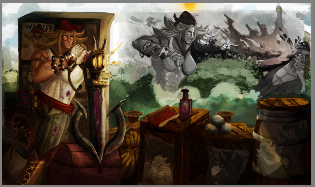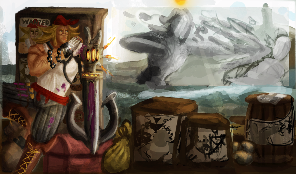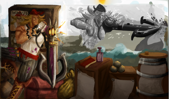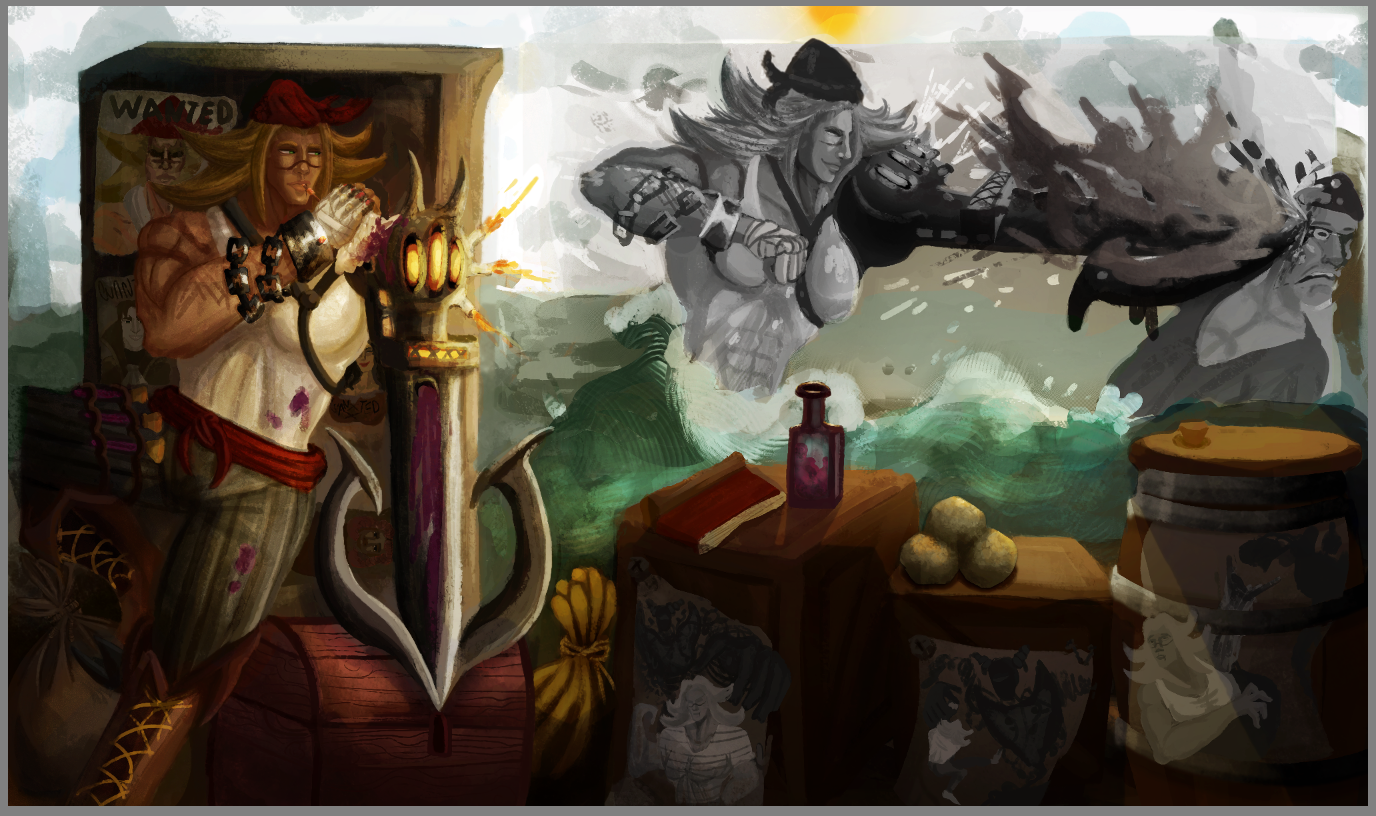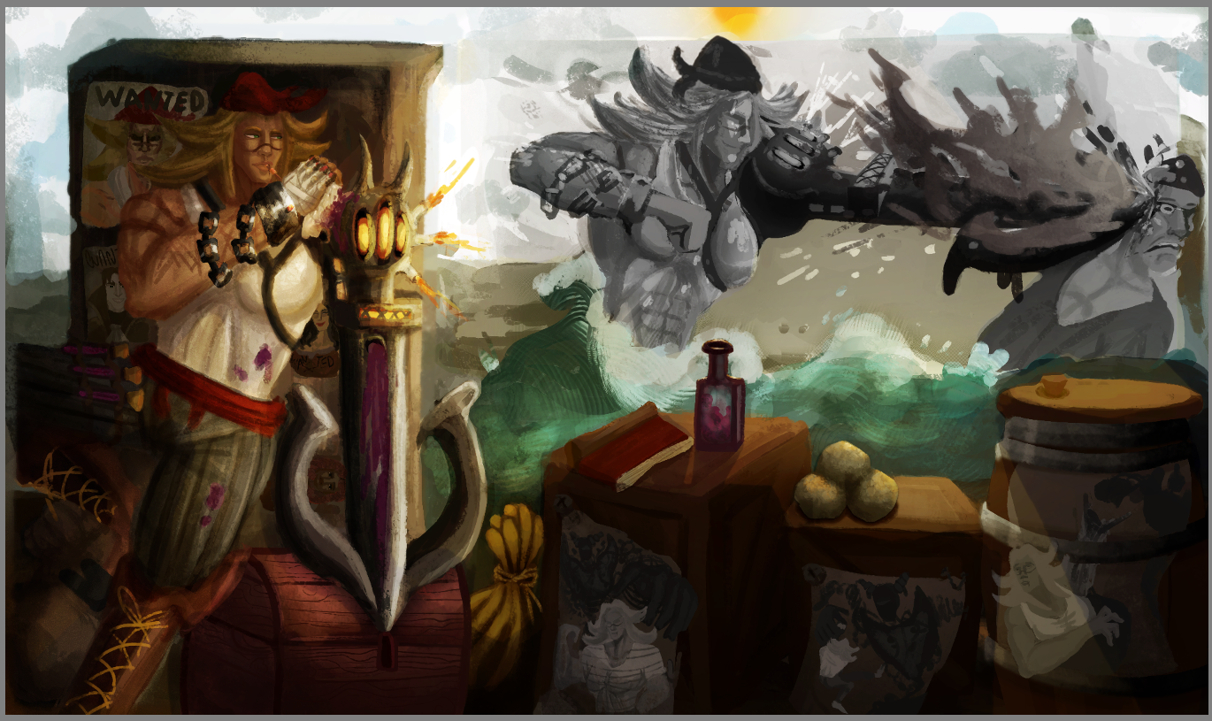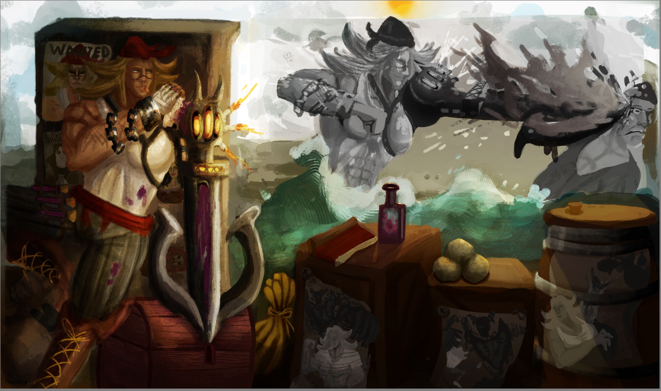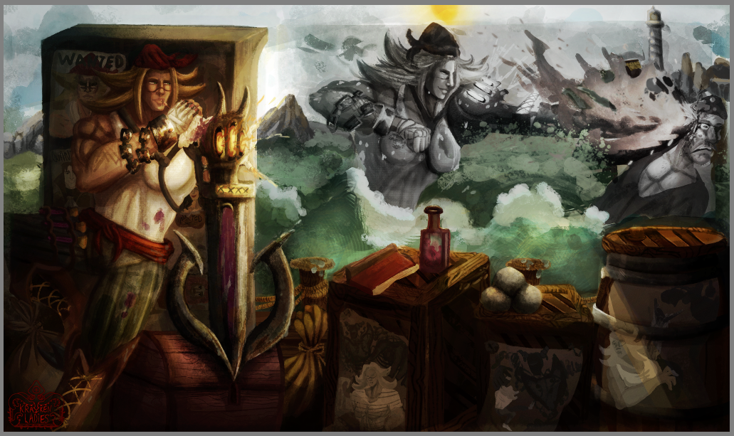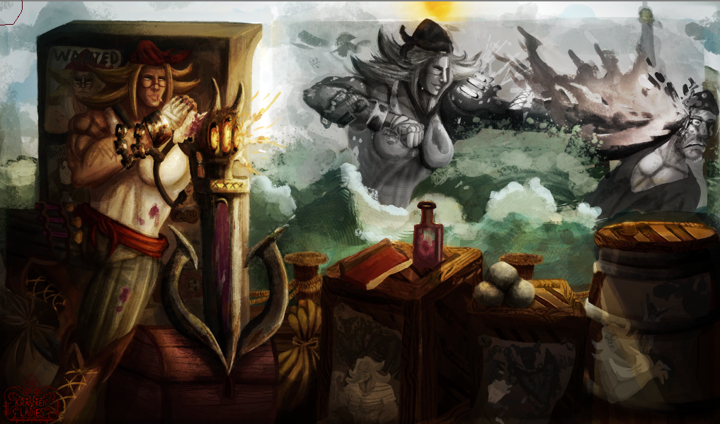 Perso la 3e a plus le cote pirate, c est celle que je prefere. La 2e est la plus elegante mais le coté pirate ne ressort pas beaucoup. Je suis partie sur Katryna aussi mais un autre style, j aime beaucoup decouvrir ce que d autres personnes font sur un meme sujet. Ton idee me plait bien, hates de voir la suite. bon brush. -