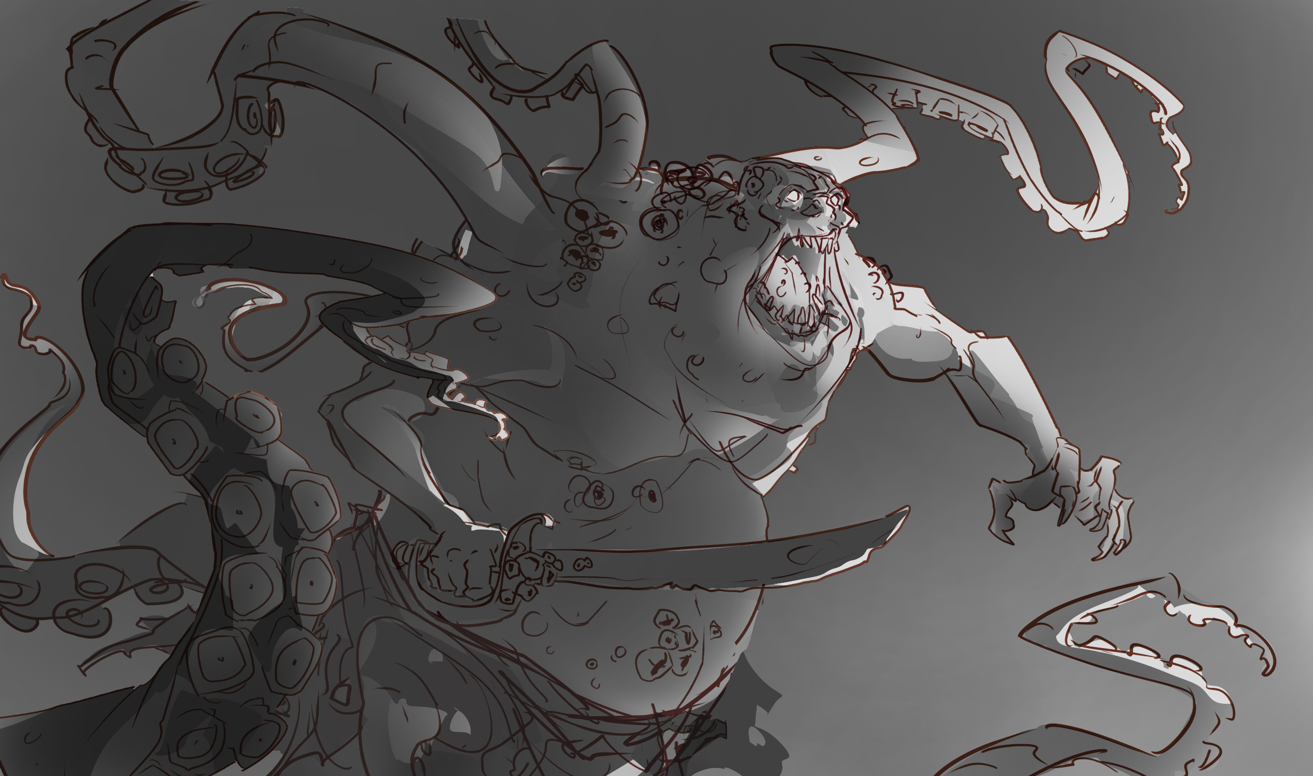 Je vais tenter de refaire le sac de tentacules en une illustration. Du coup j'ai revu le cadrage et la pose. je vais partir de cette base :
