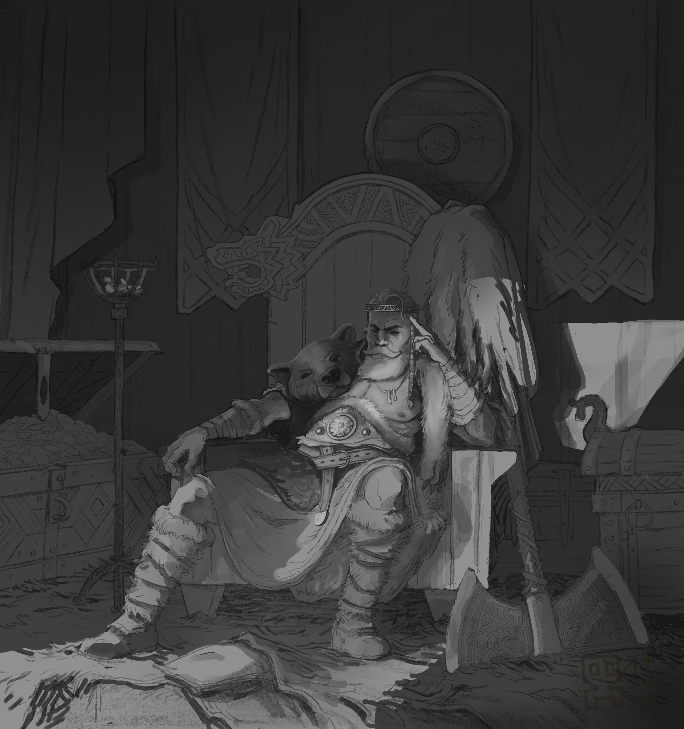 Salut ! J'ai laisser de côté Roger Boum-Boum, ce brief m'a pas mal inspiré ! Avec ses yeux et sa hauteur, personne ne peux l'approcher discrètement, il vomi à forte pression des pièces d'or. Ses bras planté dans la terre ressortiront devant la grotte, pour la défendre et balancer des coffres.