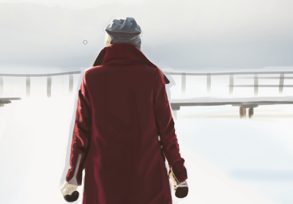 je retravaille d'un peu plus près la dame au milieu, voici mon zoom que j'utilise et le rendu "pour l'instant" je sens que si je continue je vais refaire la photo, ce soir je n'ai fait que la tete, les épaules et les manches, ça reste un exercice amusant, et j'ai jamais atteins un niveau de precision comme celui ci. je vais finir les contours de la dame et m'arreter la, et peu être mettre un coup de flou dans les coins en bas (neige) Pour les delimitations, je parlais de cet effet où la couleur s'arrete net alors que autour il y a un dégradé. (comme travaillé au lasso) mais c'est dans l'ordre d'application de la couleur que ça ce joue.