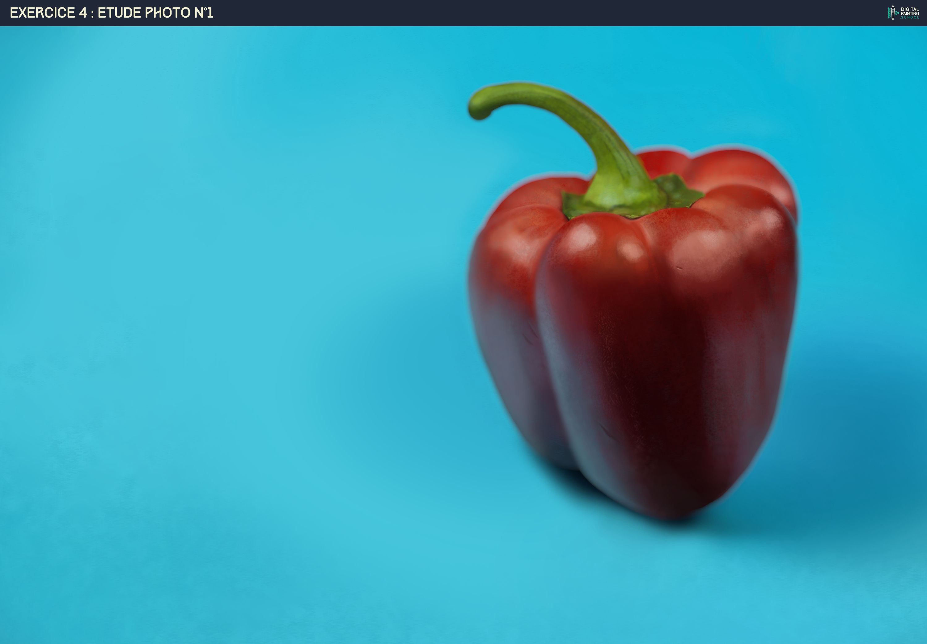 Hey @fred21 yes c'est un peu mieux pour les correction ça avance 😉 alors pour améliorer cela je te conseille : -tu peux venir blender ton ombre avec le rouge ici et le rendre la delimitation plus soft -pareil ici entre la delimitation de ton ombre et du reflet , tu peux rendre ça plus soft -pour le moment le rouge du haut de ton poivron est trop foncé il devrait etre plus clair et dans des tons rouges plus chaud :;) tes reflets de lumière pareil sont trop jaune pour le moment il devraient être un peu plus clair et plus proche d'un blanc -sur le côte droit de ton poivron dit toi qu'il ne devrait quasiment pas avoir de rouge , tout le bas de ton poivron est dans l"ombre donc toutes les couleurs sont dans des ton froid , sur cette partie a droite tu a surtout un espèce de rouge/violet foncé avec un reflet du sol bleu/violet un peu plus clair 😉 sur la partie arrière ce qui ne vas pas c'est que tes partie sombre sont bcp trop foncées et tes parties claires bcp trop claires , tu devrait juste être sur un rouge chaud et lumineux avec très peu d'ombres ou de différences de valeurs - ref -il te manque un reflet grisâtre blanc ici aussi sur le côte droit -sur la tige tu peux également rehausser ton vert le plus sombre et venir le rendre plus claire et plus chaud 😉 voila j'espère que ça t'aidera 😉 keep going !;)