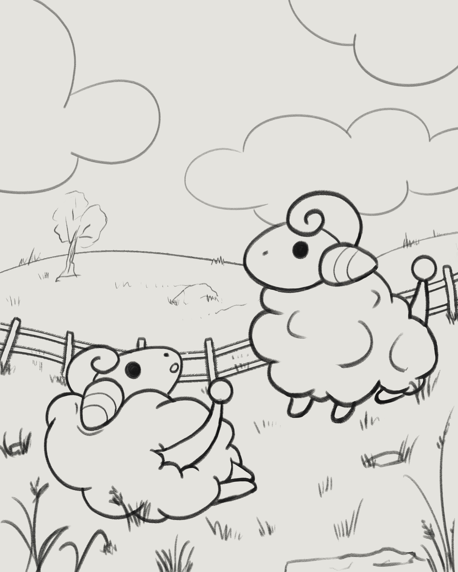 @kyuare Merci beaucoup pour tes retours ! Et oui effectivement j'ai bien galéré sur l'herbe j'avais vraiment du mal à la synthétiser 🫠 par contre j'ai pas utilisé de custom brush j'ai tout fait avec le même brush effet crayon à papier que j'ai utilisé pour le reste, mais en regardant mieux après coup c'est vrai que machinalement j'ai fait les mêmes mouvements plein de fois c'est pas très naturel 😂 Et voilà pour le croquis de mon digital painting ! Exercice 7 :