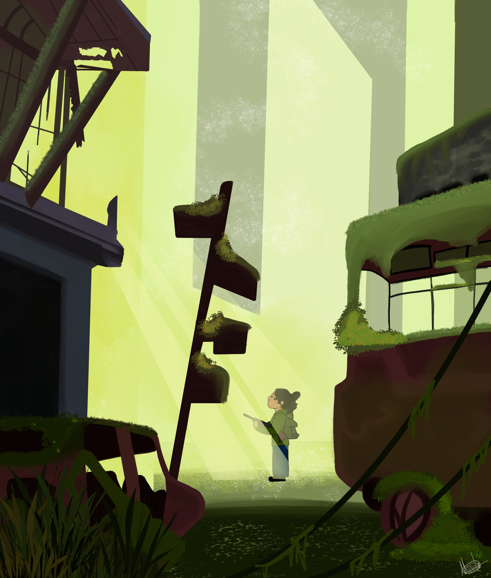 Hey, hey je poste mon illustration qui suit l'exercice du chapitre 0, et ensuite pouvoir réaliser plus tard la même illustration, mais à la fin du chapitre 1 ; pour ainsi voir l'évolution ! l'illustration a été faite en pleine période où je joue au jeu The Last of Us avec ma meilleure amie (que j'ai tenté de représenter dans le dessin). Je cherchais plutôt à réaliser un décor apocalyptique, sans trop focus sur le personnage, et tenter de jouer avec les lumières et les contraste de décor illuminé/non illuminé. Breff, j'ai essayé de pas me casser la tête, de faire avec les connaissances que j'avais sur le moment, pour être plus enclin à voir l'évolution dans le chapitre 1 (je suis en panique totale, mais tout va bien😅).