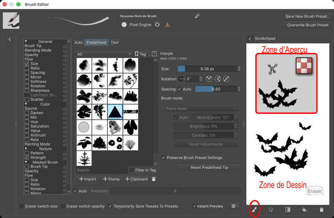 Bonjour à tous, Dans l'exercice 3 du chapitre 8, il est demandé de créer son propre custom brush pour faire une nuée de chauve-souris. Je vous fais un petit how-to : Dans Krita, les brushes avec plusieurs formes sont appelées "brush animé" et sont construites comme suit : Créer une nouvelle image d'environ 500x500 px 1) Sur un 1er calque dessinez la 1ère forme en noir pur ou en niveaux de gris à 100 % d'opacité (sauf si vous voulez des effets de transparence, auquel cas vous pouvez jouer sur l'opacité, mais sans changer la couleur), puis supprimez le calque de fond blanc. 2) Créez un nouveau calque par dessus le premier et dessinez la deuxième forme de la même façon que précédemment (vous pouvez masquer le calque précédent si il vous gêne). 3) Continuer le processus jusqu'à avoir toutes tes formes chacune sur un calque séparé. 4) Une fois que c'est fait, réafficher les calques masqués, puis faire un click droit sur la vignette du 1er calque dans la pile de calque et choisir l'option "isoler le calque". Répéter cette opération pour chaque calque. 5) Ouvrir l'éditeur de brush (F5), CLIQUER SUR SAVE NEW BRUSH PRESET en haut à droite pour faire une copie du brush que vous allez modifier. Une nouvelle fenêtre s'ouvre dans laquelle vous pouvez donner un nom à votre nouveau brush, choisir une icône différente pour le retrouver plus facilement (facultatif). Une fois terminé, cliquer sur Save. La fenêtre se ferme et vous devez normalement être sur ce nouveau brush, lequel est pour l'instant une simple copie du brush existant. 6) Maintenant on va modifier cette copie.. Ouvrez à nouveau l'éditeur de brush avec F5. Vérifier que le nom du brush est bien le bon (dans cet exemple : Nouveau Nom de Brush). Puis aller dans la section "general", "brush tip", "predefined",et cliquer sur "Stamp" 7) Une fenêtre s'ouvre dans laquelle vous pouvez donner un nom à cet ensemble de formes, régler l'espacement entre les formes etc. Dans le style de brush, choisir "animated" (animé), puis dans selection mode choisir 'random" (aléatoire). puis cliquez Save. 8 ) La fenêtre se ferme et vous revenez dans l'éditeur de brush. VERIFIEZ LE NOM DE VOTRE NOUVEAU BRUSH. Réglez la taille du brush (size) et le pas (Spacing) en faisant des essais dans la zone de dessin. Le pictogramme de corbeille en dessous de la zone de dessin permet d'effacer celle-ci. 9) Quand vous êtes satisfait de vos réglages, cliquez sur le pictogramme de pinceau sous la zone de dessin pour que l'icône choisie à l'étape 5 s'affiche dans la zone d'aperçu. 10) Vous pouvez alors dessiner dans la zone d'aperçu pour améliorer la représentation de votre nouveau brush. 11) Cliquez sur "OVERWRITE BRUSH PRESET" pour sauvegarder votre brush avec ces réglages. Attention, si vous n'avez pas fait une copie du brush à l'étape 5 ou que le nom du brush que vous avez choisi existe déjà, le nouveau brush remplacera celui existant et ce dernier sera perdu (bien que récupérable). Votre nouveau brush est à présent dans la liste des brushes sans tag, retrouvez-le et assignez lui le tag que vous voulez...-