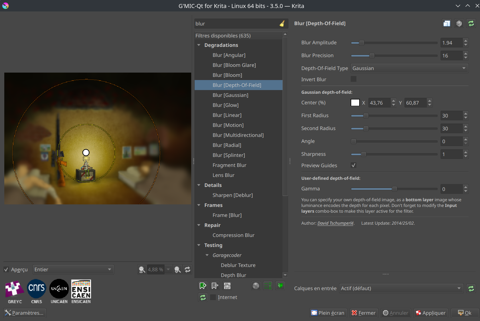 11. Salut @dracenne et @Shpok, pour le flou de diaphragme (Depth-of-Field) entre autres flous. Vous le trouverez, en plus d'une myriade d'autres effets, dans le menu Filtre> Lancer G'mic-Qt. Une fois G'mic lancé, taper blur dans sa barre de recherche et vous aurez du blur en veux-tu en voilà!^^ Cela devrait ressembler à l'image ci-dessous: