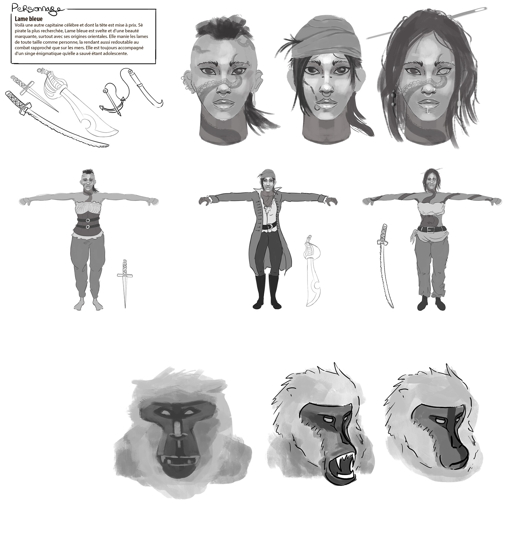 Bonjour, je me lance sur le challenge de la piraterie avec le perso Lame Bleu Voici quelques recherches de design, pour le moment je suis partie sur la tête 1 avec les habits 3, j'aime bien l'idée du tatouage de pieuvre qui suit les membres du corps. Pour l'épée je préfère la grosse épée de pirate. Le singe pour le moment c'est pas claire donc je vais travailler dessus plus tard... Vous en pensez quoi ?
