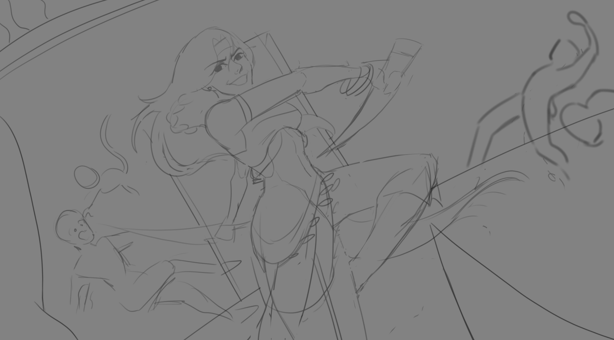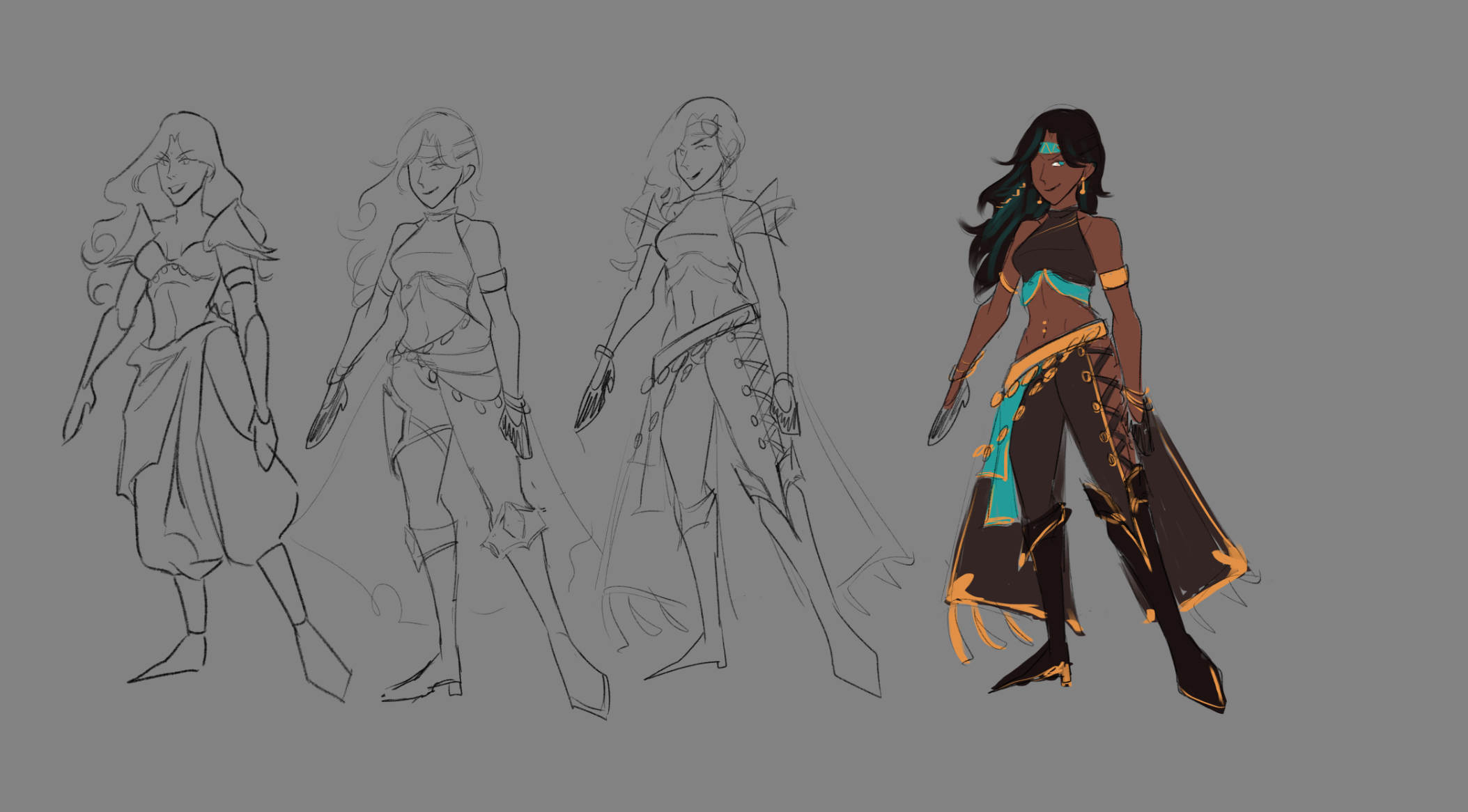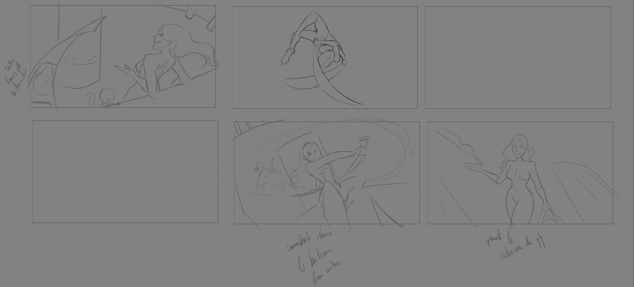 Hey, j'ignorais qu'il fallait créer un forum quand j'ai commencé à dessiner pour le concours hahah. Donc voici mon travaille jusqu'ici. J'ai tout d'abord créé le character design à partir de la description. J'ai tout de suite relié le nom de Lame Bleue à ses armes lorsque j'ai lu sa description. Ainsi, j'ai créé quelque design en essayant de mêler la beauté orientale et le bleu qui la caractérise. Par la suite, j'ai procédé à l'élaboration de quelques idées de croquis. En première case, je l'ai imaginé de dos avec son compagnon, lançant au vent son avis de recherche. En deuxième case, je l'ai imaginé dans une pose plus dynamique mais je n'ai pas trouvé d'idée de fond adéquate. En troisième case, j'ai pensé à une scène de combat. Lame Bleue, deux longues dagues en main est représenté en pleine action, tranchant ses ennemis. Je me suis amusé à mettre son compagnon en fond attaquant un ennemi. Je trouvais ça amusant ! Pour la quatrième case, Lame bleue fait tournoyer son arme de la main gauche, et de la main droite elle tient un ennemi vaincu. J'ai choisie la troisième image par son dynamisme et aussi pour le côté fun du singe ! j'en ai donc fait un croquis taille réelle. Puis j'ai placé des couleurs Et voilà je continue de travailler dessus 🙂 j'enverrais régulièrement des WIP jusqu'à la fin de l'illustration ! Merci et à bientôt ! Bon courage à tout le monde !