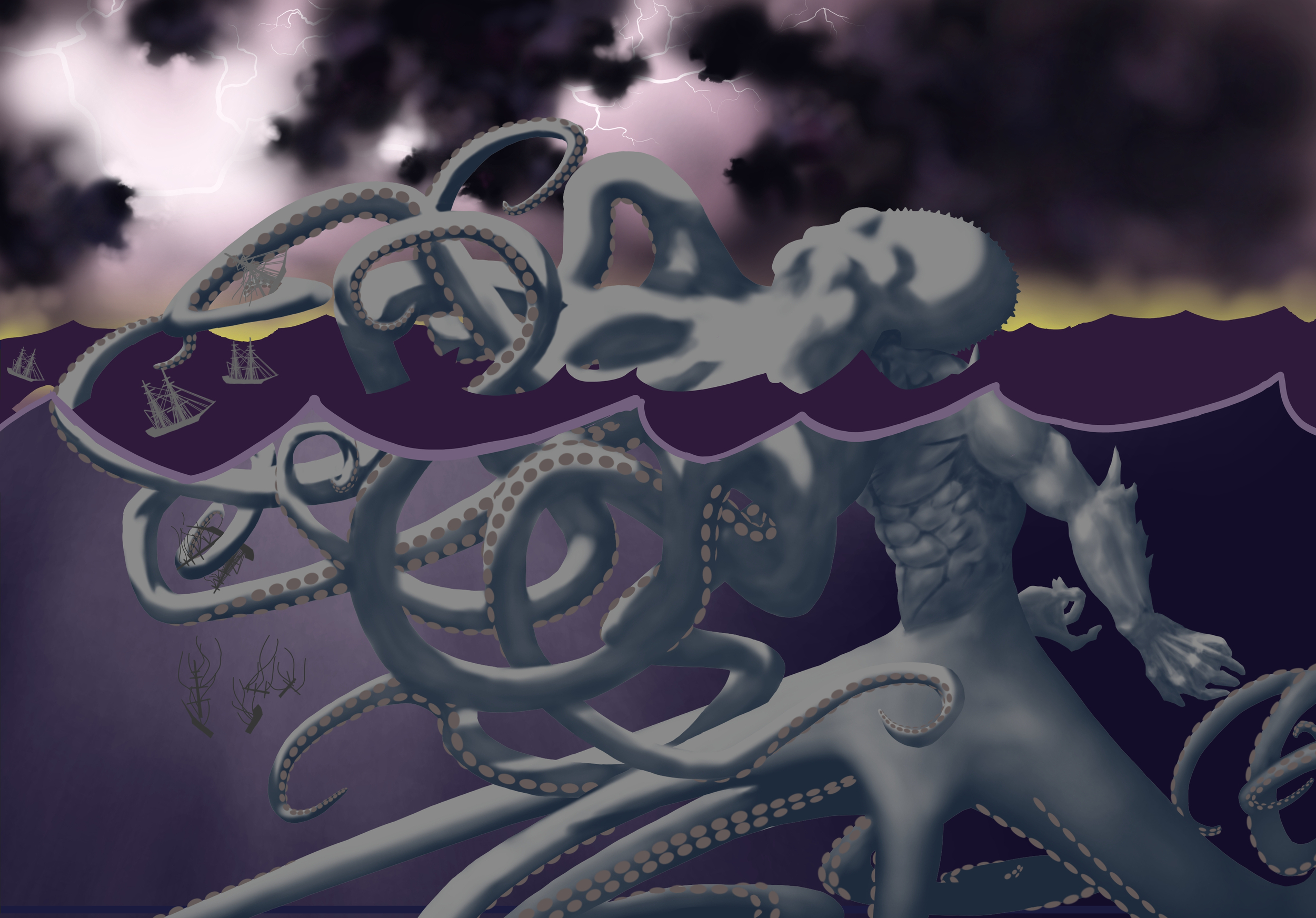 Alors, j'ai bien compris que ma scène pourrait fortement gagner en dynamisme avec une compo très différente (par exemple : bateau au premier plan, kraken au second, utilisation de la plongée/contre-plongée, etc.) Mais je suis un peu têtu, donc je reste sur mon plan classique vue de profil, parce que je l'aime bien ^^ Ceci étant dit, j'ai essayé de tenir compte de certains des retours très qualitatifs qui m'ont été faits (merci encore à tou.tes les contributeur.ices), pour améliorer malgré tout le painting sans changer complètement d'angle de vue. Je suis reparti sur une flotte plutôt qu'un bateau seul : pour ajouter en dynamisme via l'interaction kraken/bateaux pour pouvoir conserver un ou deux navires encore hors d'atteinte, parce que j'aime bien l'idée que certains des malheureux pirates ne peuvent que constater que la mort leur arrive dessus J'ai fait quelques tentatives de combiner vue en coupe de l'océan ET vision de sa surface pour gagner un peu en profondeur pour tenter d'amoindrir un des principaux problèmes de ma compo (si j'ai bien compris) : elle est toute PLATE pour pouvoir montrer plus facilement les gerbes d'eau qui seront soulevées par les tentacules J'ai finalement accepté l'idée de ne pas montrer le kraken en entier, en coupant les jambacules (il a fallu 2-3 personnes bien avisées pour me convaincre 😅) Résultat : Merci beaucoup, ça me semble déjà vachement mieux, tout en me permettant de ne pas "trahir" mon idée de départ ! Je post ci-dessous le avant-après. Qu'en pensez-vous ?