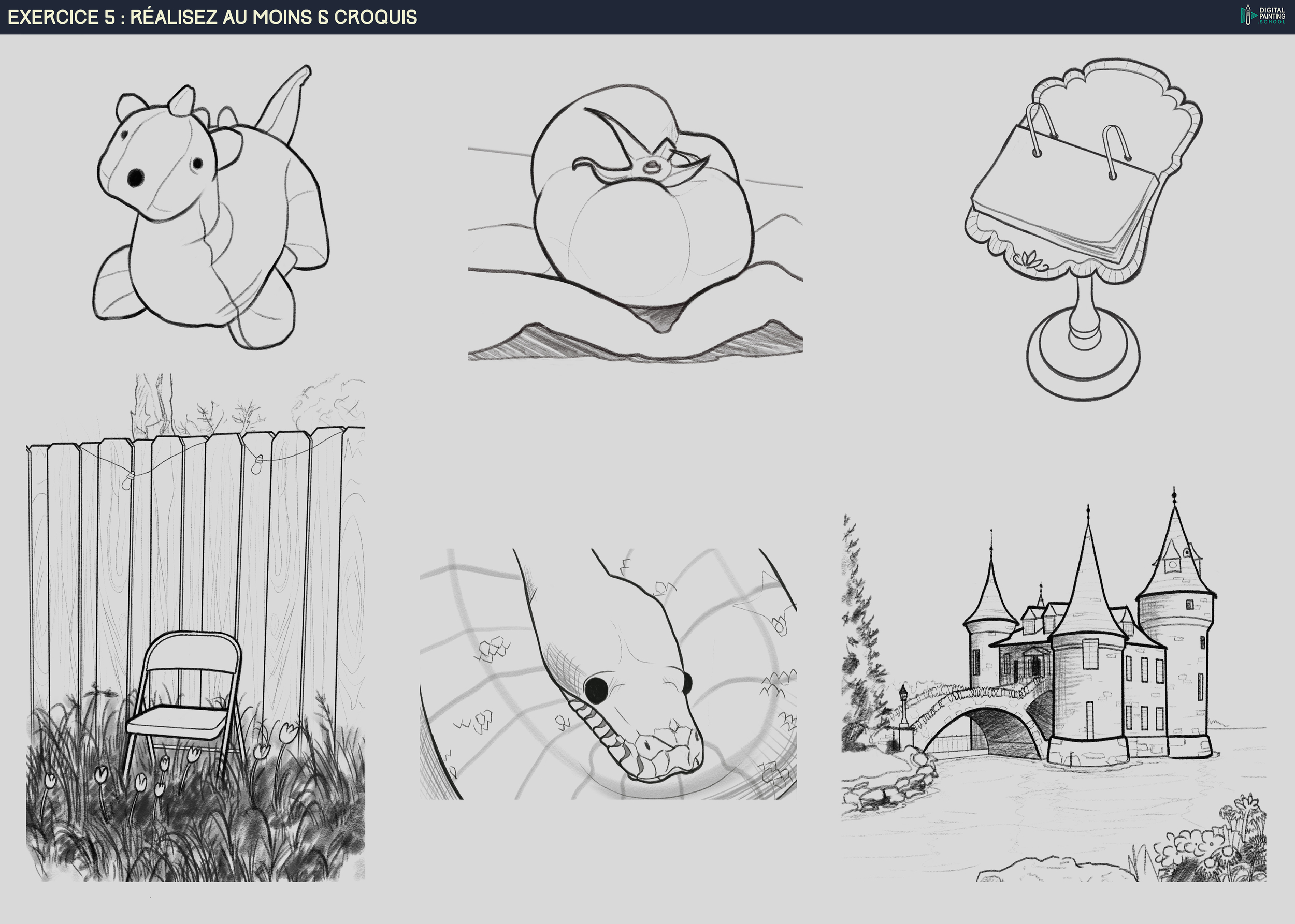 Bonjour bonjour ! Et voilà pour les 6 croquis sous format planche avec les refs dans un autre poste en dessous parce que je suis pas arrivée à faire rentrer les deux dans le même 😬 Exercice 5 :