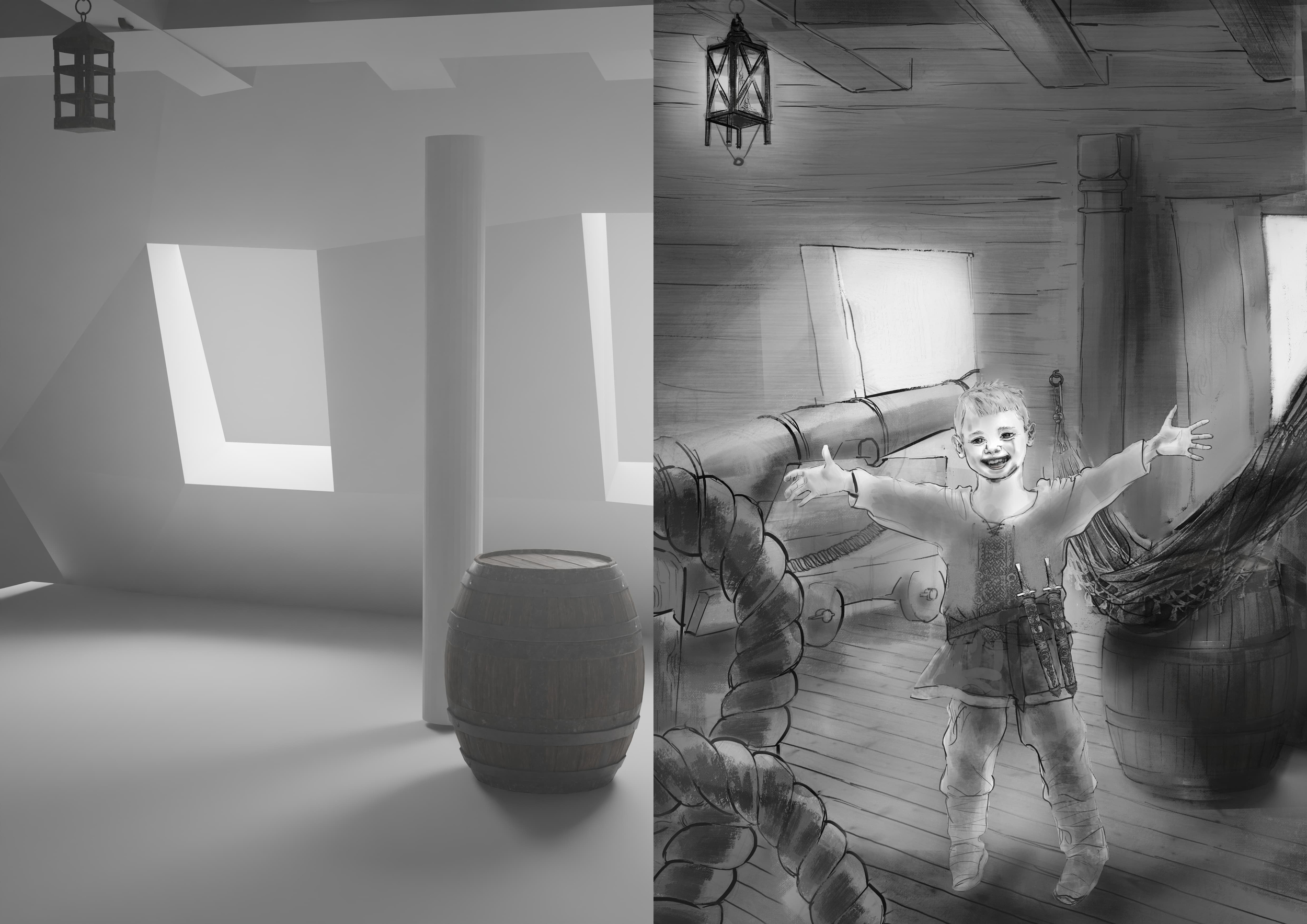Bonjour ! Voilà où j’en suis. J’ai brièvement mis les valeurs pour l’image avec les lignes les plus propres. Je vais voir ce que je fais au plafond, surement à la fin, parce que le personnage est ma priorité. Je me suis vraiment fait du mal sur ce challenge, avec une perspective que je n’ai jamais vraiment faite, l’angle et la pose non plus, mon cerveau va exploser lol. J’espère quand même que c’est crédible. Si vous voyez des choses incorrectes, faites m’en part. Pareil en terme de compo (même si ça va être compliqué de changer…). J’ai fait au mieux avec mes capacités actuelles. J’ai hâte de passer à la couleur, c’est un peu déprimant le noir et blanc à la longue. Ah oui je pense mettre du flou sur les rideaux et probablement un peu sur la lame. Mais bon ça ce sera à la fin, donc c’est pas pour tout de suite ! A très vite !