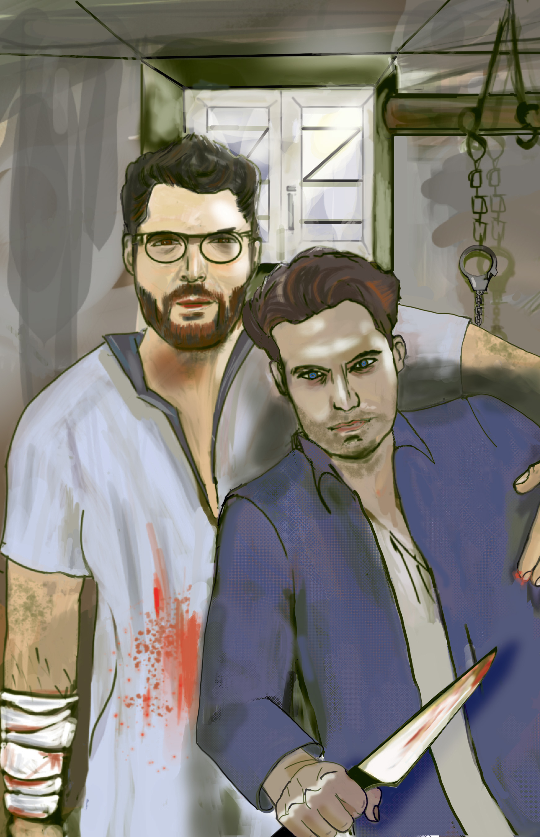 Bonjour, nouvelle je tente d'améliorer mes illustrations. Notamment celle-ci ! L'histoire : c'est deux auteurs sexys qui suite à de trop nombreuses critiques, ont décidé de poursuivre, de séquestrer et de tuer tous ceux qui ont posté ou critiqué leur façon d'écrire. la scène je l'ai inventé mais les visage sont faits d'après photo ci-dessous. Merci de vos retours Les photos sont libres de droit. Pardon à Mat-bzh d'avoir écris sur son post - Aujourd'hui