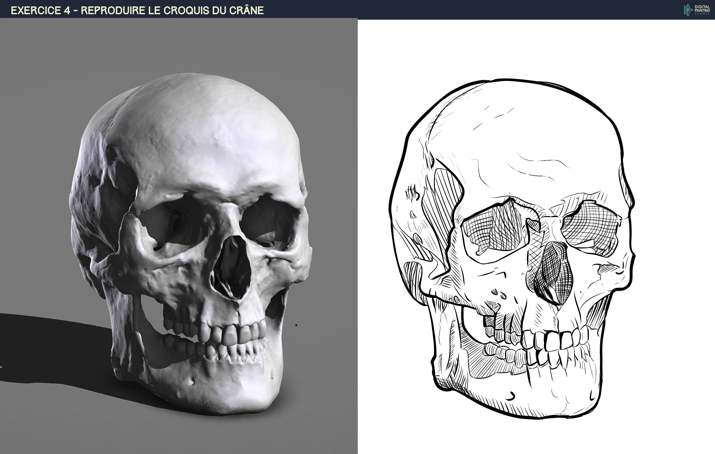 salut merci pour toutes ces indications ! J'ai retravaillé le crâne à partir de tes suggestions. J'ai utilisé le lasso et l'outil transformation pour modifier les yeux notamment. Merci pour ton explication sur les étapes du croquis, je vais essayer de faire cela pour les prochains exercice !